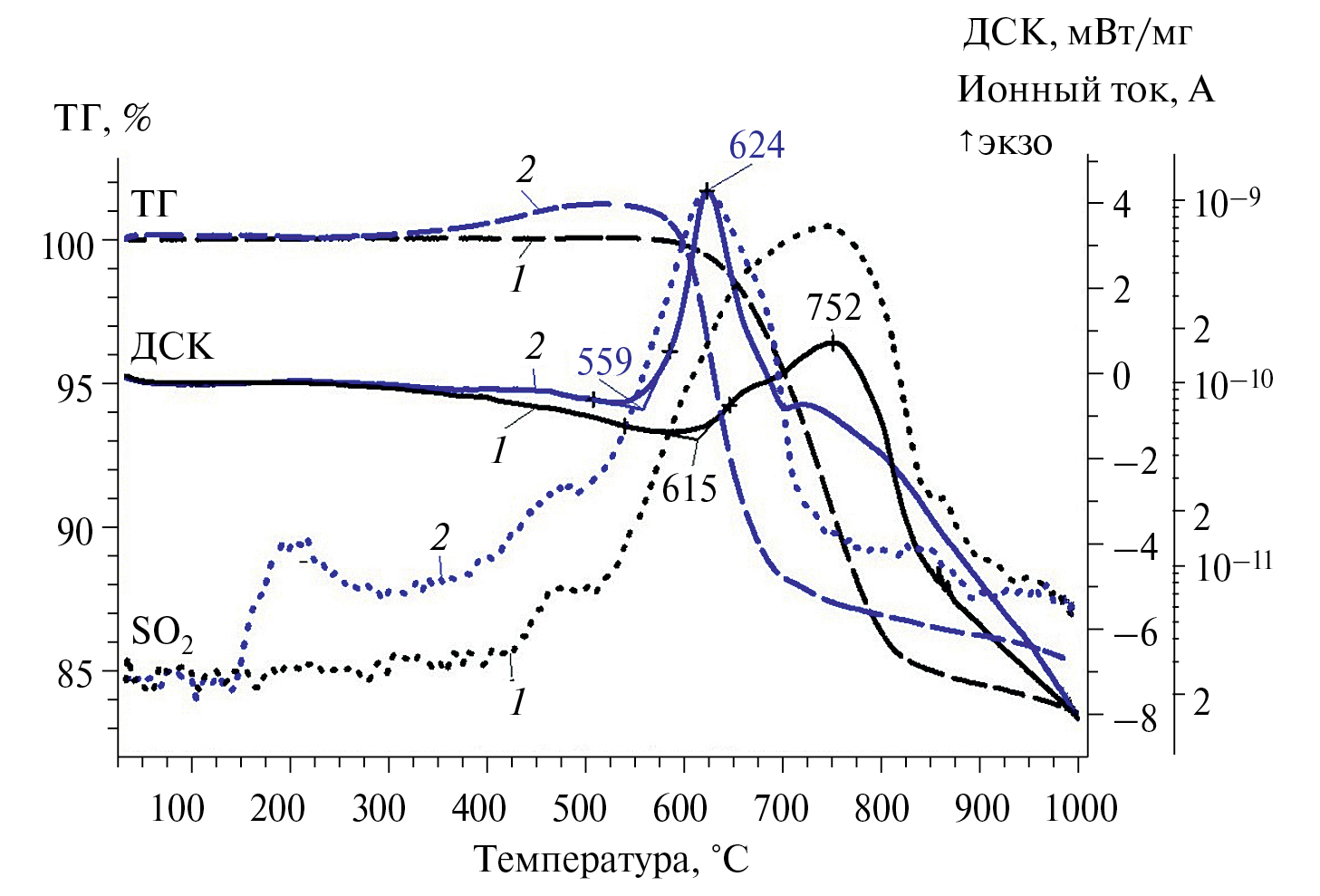 Рис. 5. Изменения массы (ТГ), теплового потока (ДСК) и ионного тока с атомной массой 64 а.е.м. (SO2) при нагреве (10°С/мин) в потоке воздуха исходного (1) и механоактивированного в течение 20 мин (2) сфалерита.