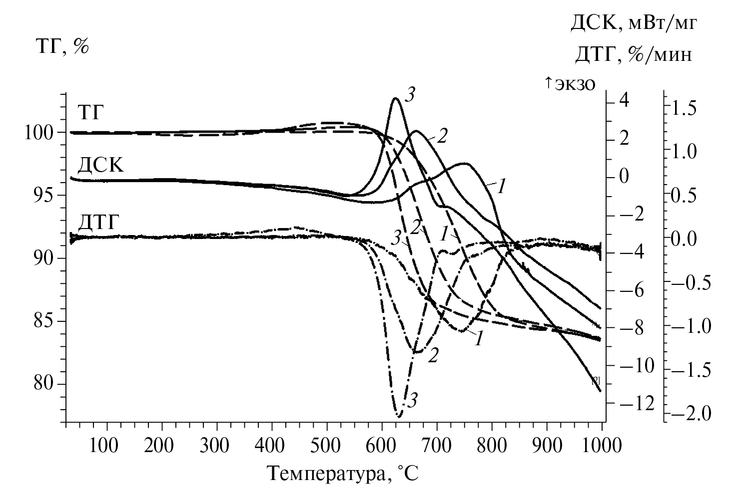 Рис. 6. Изменения массы (ТГ), скорости ее изменения (ДТГ) и теплового потока (ДСК) при нагреве (10°С/мин) в потоке воздуха исходного (1) и механоактивированного в течение 1 (2) и 16 мин (3) сфалерита.