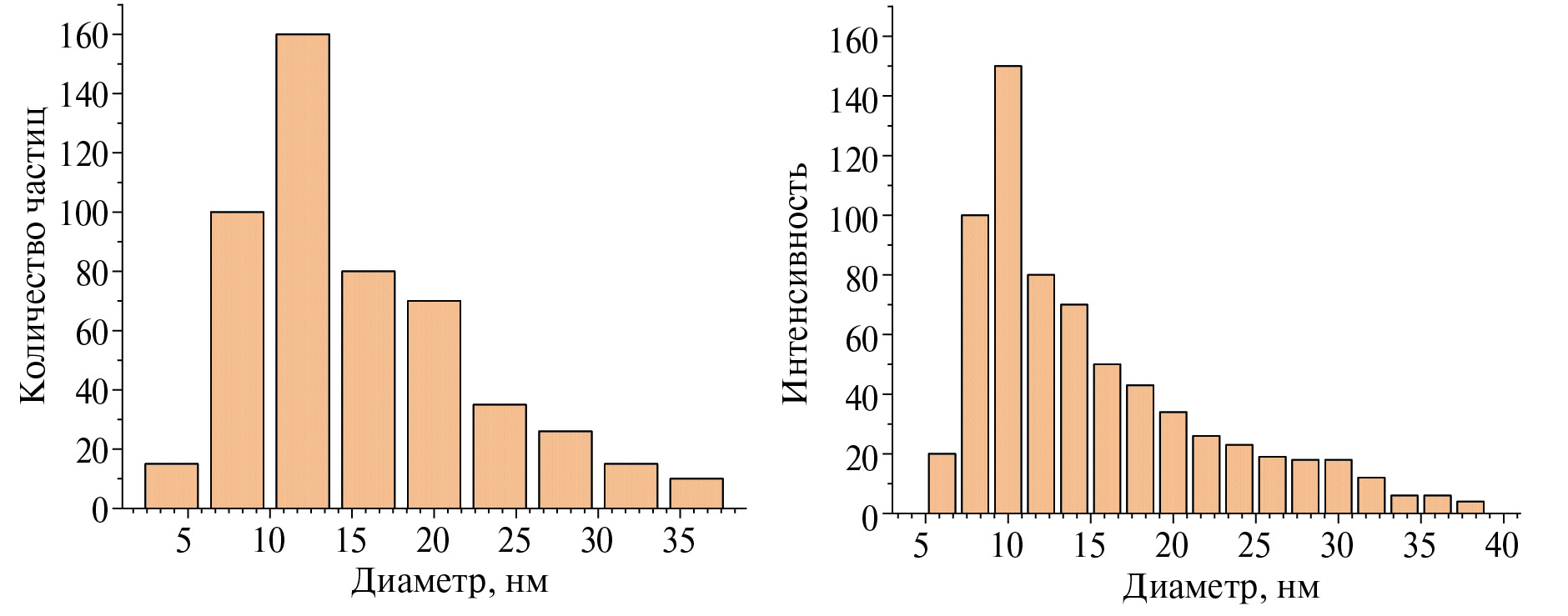 На рис. 4 представлено распределение наночастиц карбида титана. Анализ распределения наночастиц TiC с усредненным удельным размером 12 нм указывает на их монодисперсность, однако присутствуют более крупные частицы, примерно 20 нм в диаметре. Наблюдается небольшое отклонение в распределении по интенсивности и количеству НЧ, что также позволяет сделать предположение об их монодисперсности. Это предположение подтверждается индексом полидисперсности, оцененным на уровне 0.184.