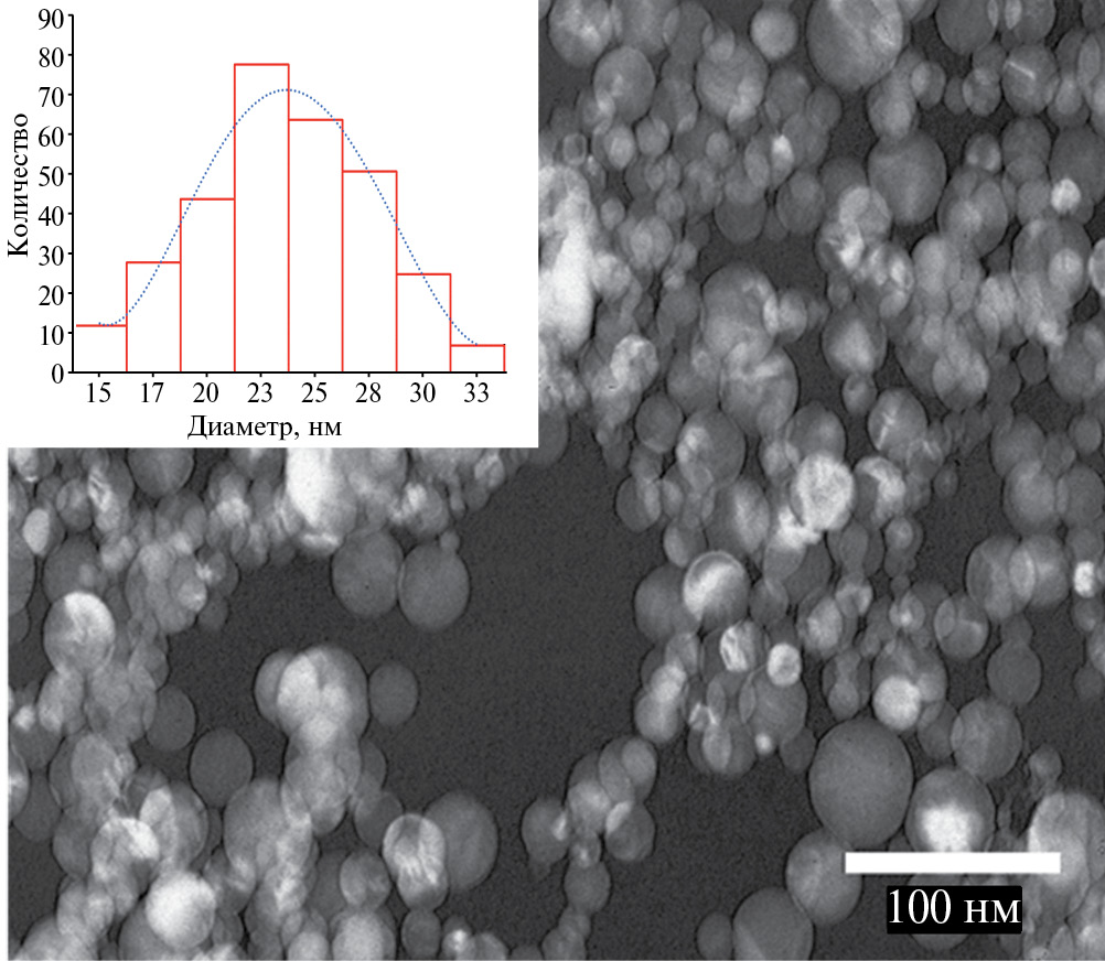 На рис. 7 представлено распределение наночастиц “ядро/оболочка” Fe@Fe3C. Анализ распределения наночастиц с усредненным удельным размером в 24 нм указывает на их монодисперсность, однако наблюдаются более крупные частицы, примерно 30 нм в диаметре.