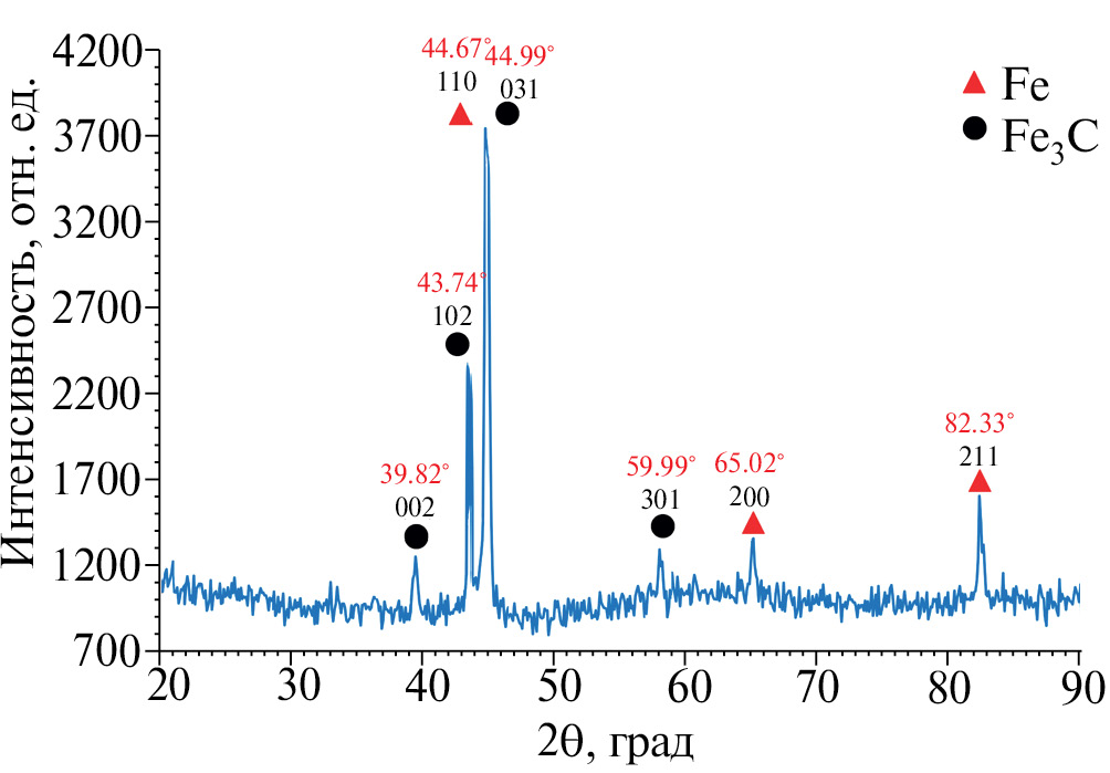 На рис. 4 представлена рентгенограмма наночастиц карбида железа, полученных методом индукционной потоковой левитации при использовании паров гексана в качестве реагента. При сравнении со стандартом карбида железа (PDF № 35-0772) наблюдаются характерные дифракционные пики Fe3C при 2θ = 39.79°, 43.76°, 44.99° и 57.99°. Они соответствуют плоскостям (002), (102), (031) и (301) орторомбической структуры (пр. гр. Pnma).