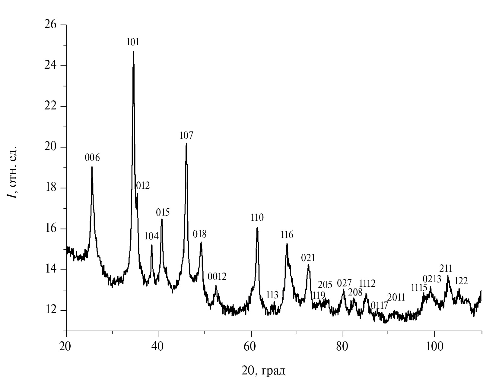 Методы анализа. Рентгенофазовый анализ (РФА) полученного Mo2B5 проводили на дифрактометре PANalytical AERIS. Регистрацию дифрактограмм вели в режиме пошагового сканирования на излучении CuKα в интервале углов 2θ 20°–110° с шагом съемки 0.02° и экспозицией 4 с в точке. Для расчета размера кристаллитов – областей когерентного рассеяния (ОКР) использовали метод вторых моментов.