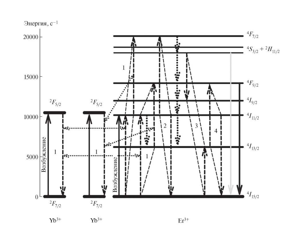 1 – 2х (2F5/2 – 2F7/2 (Yb3+) + (4I15/2 – 4I11/2, 4I11/2 – 4F7/2)/(4I15/2 – 4I11/2, 4I13/2 – 4F9/2) (Er3+), ап-конверсия;