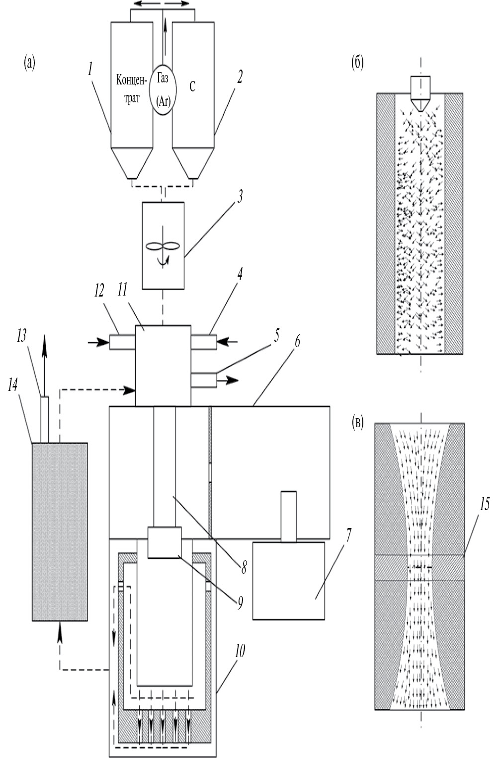 Рис. 1. Схема размещения магнетрона и плазмотрона косвенного действия на волноводной камере: а – схема исполнения аппаратной части, б – канал плазмотрона, в – канал концентратора; 1 и 2 – загрузочные емкости концентрата и графита, 3 – смеситель, 4 – подвод газа, 5 и 12 – отвод/подвод охладителя, 6 – волновод, 7 – магнетрон, 8 – огнеупорная трубка, 9 – концентратор, 10 – плазменный реактор с футеровкой, 11 – плазмотрон, 13 – отвод газа, 14 – фильтр тонкодисперсный, 15 – вставка.