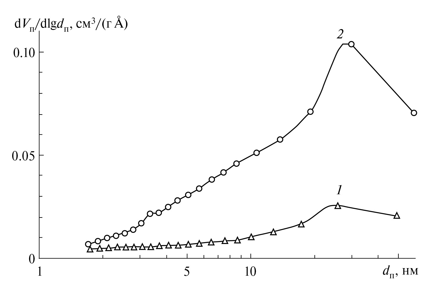 Рис. 5. Распределение пор по размерам в порошках тантала, полученных восстановлением Ta2O5 парами кальция (1) и магния (2); удельная поверхность порошков: 8.2 (1), 9.6 м2/г (2).