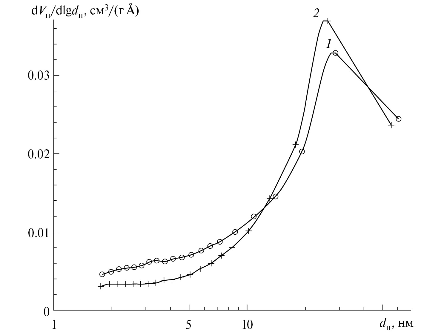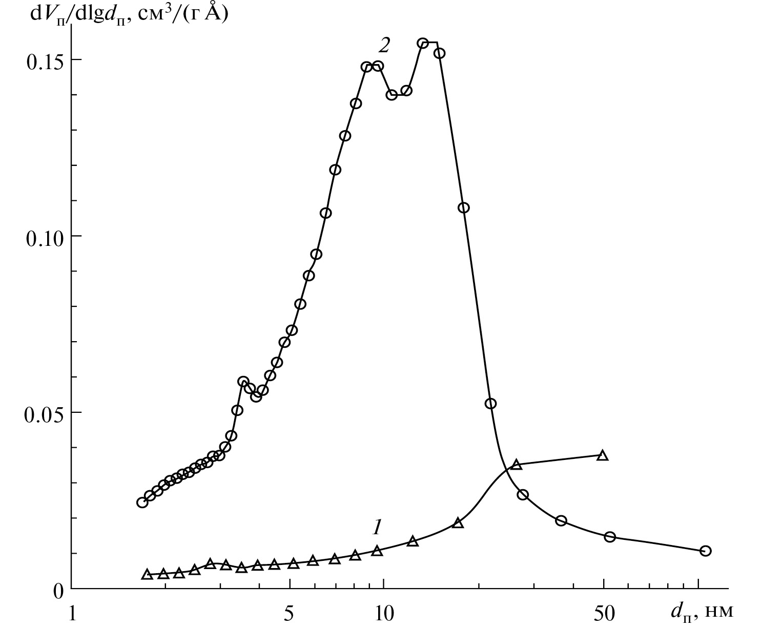 Пористые структуры кальциетермического и магниетермического порошков, полученных в интервале 1073–1123 К из пентаоксида, при близкой удельной поверхности идентичны (№ 4 и 5, табл. 2). Распределение пор в этих порошках представлено на рис. 5.