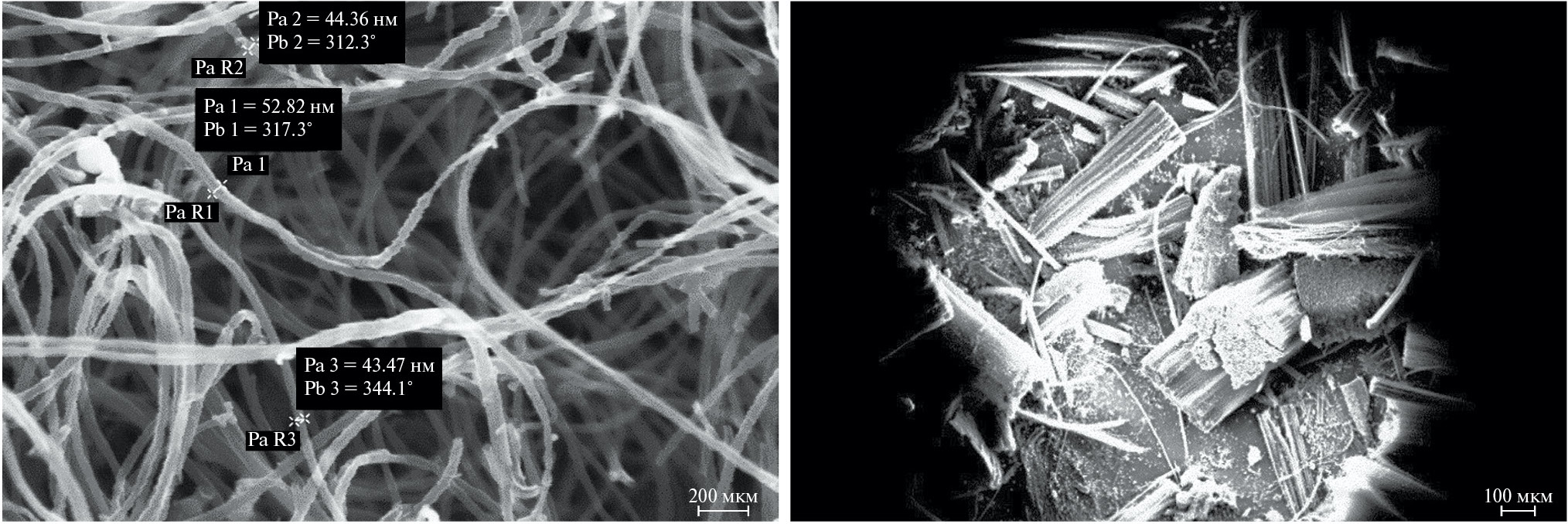 Результаты СЭМ-анализа синтезированных Fe@МУНТ представлены на рис. 2. Видно, что синтезированный наноматериал состоит практически полностью из трубчатых структур, что указывает на его высокую чистоту. Углеродные нанотрубки имеют правильную форму без ответвлений и изломов, что говорит об их высоком качестве и малой дефектности. Измеренные на снимке диаметры трубок лежат в пределах 40–55 нм. Средняя длина полученных нанотрубок составляет 500–700 мкм.