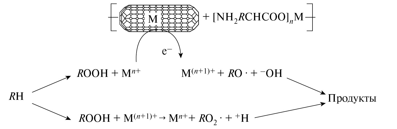 Общая схема процесса представлена на рис. 6. В результате совместного действия металлов в составе углеродных нанотрубок (железа) и комплекса аминокислоты (марганца) гидропероксид (ROOH) интенсивно распадается с образованием радикалов, активно катализирующих цепной процесс окисления углеводорода. Таким образом, смесь металлокомплексов аминокислот с металлсодержащими углеродными нанотрубками можно рассматривать как активный каталитический комплекс в цепных реакциях аэробного жидкофазного окисления углеводородов.