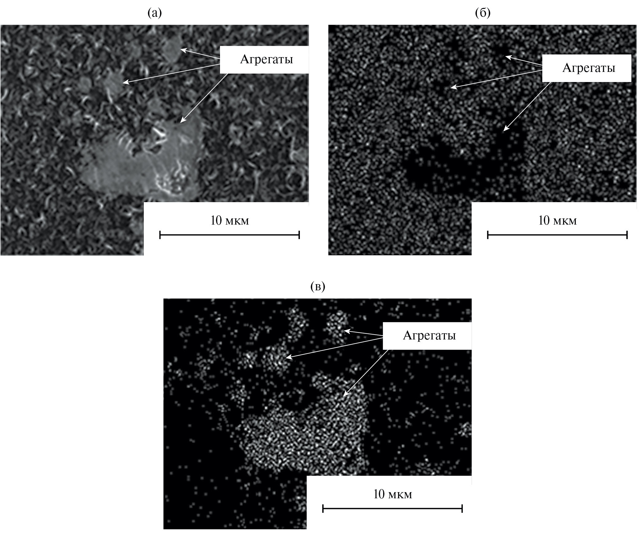 Принадлежность светлых областей на микрофотографиях фазе ZrB2 подтверждена методом картографирования циркония и углерода на микроснимках (рис. 4). Наибольшая концентрация атомов циркония наблюдалась внутри агрегатов, в то время как атомы углерода в основном были зафиксированы вне области агрегатов. Указанные наблюдения позволяют идентифицировать светлые области на микроснимках как фазу ZrB2.