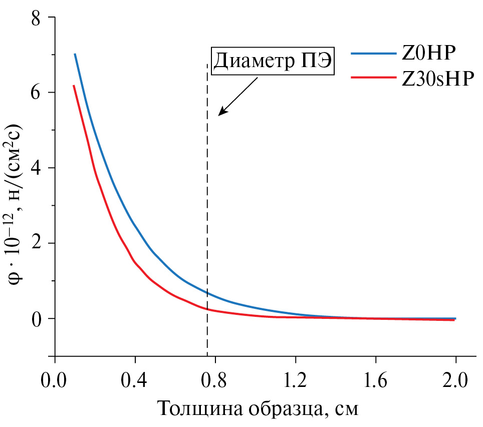 Рис. 9. Зависимости потока тепловых нейтронов от толщины образцов Z0HP и Z30sHP.