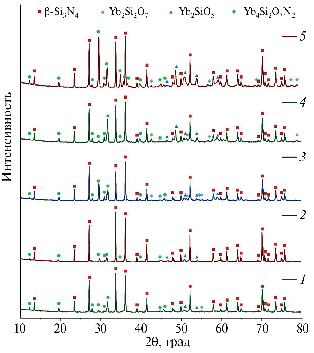 По данным РФА (рис. 2), образцы 1–5 состоят в основном из высокотемпературной фазы β-Si3N4, что свидетельствует о полноте перехода α-Si3N4 в β-Si3N4 в процессе спекания.