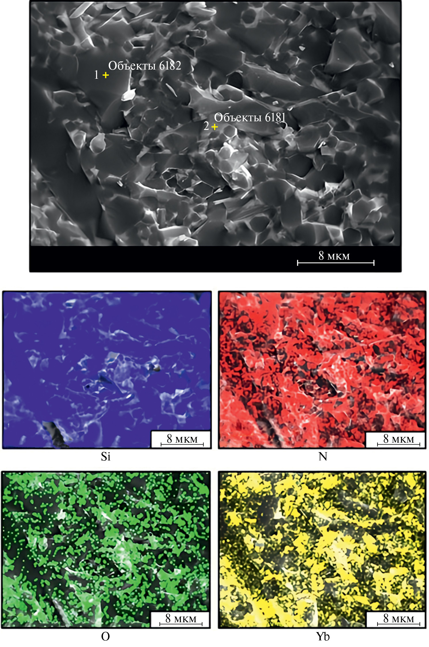 Состав межзеренной фазы также подтверждается результатами элементного анализа образцов. На рис. 3 представлена картограмма скола образца 3 в точках 1 (зерно Si3N4) и 2 (межзеренная фаза). Можно наблюдать повышенную концентрацию Yb и O в межзеренной фазе (светлые области на микрофотографии), тогда как Si и N распределены равномерно по всему объему материала.