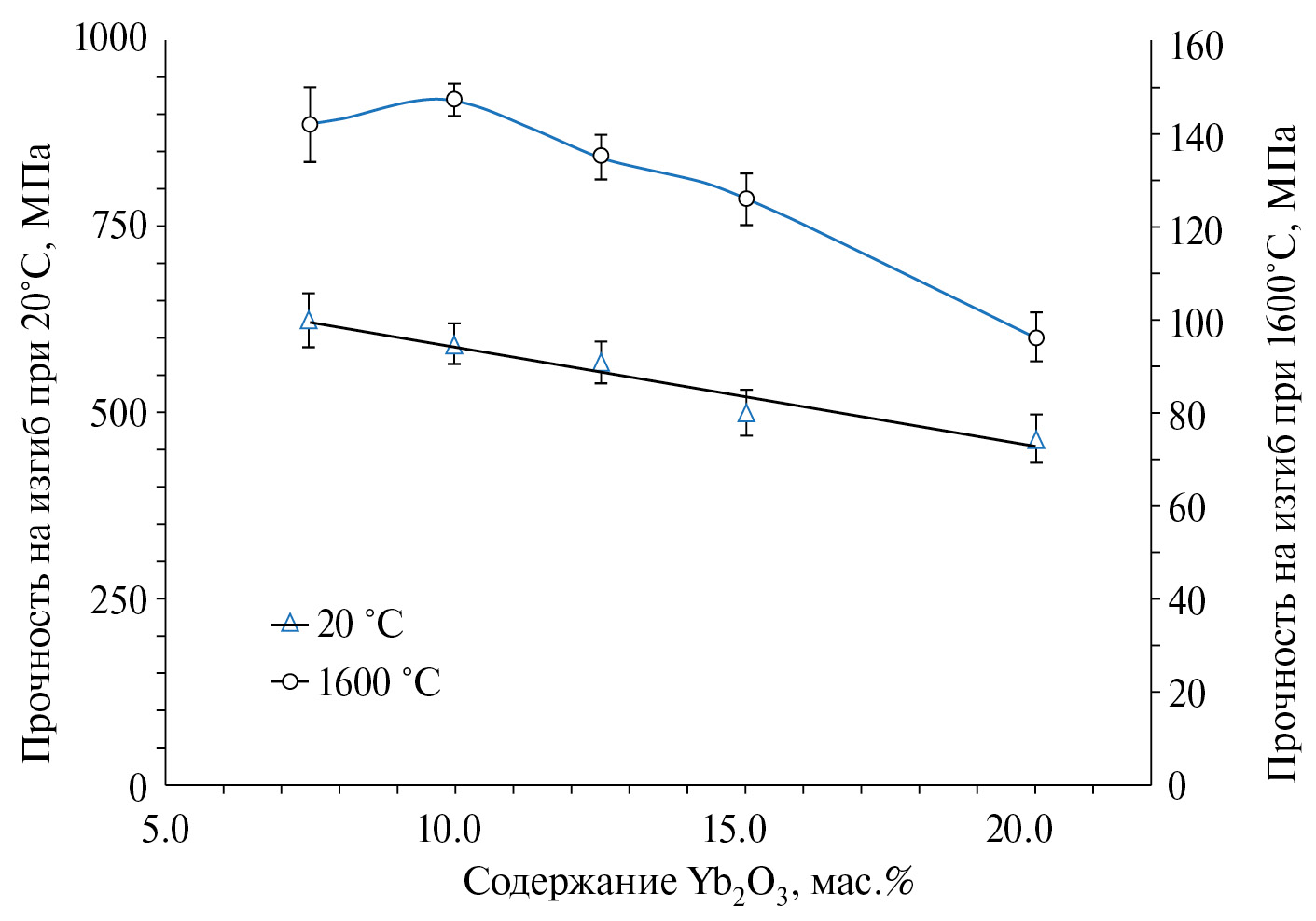 Рис. 5. Зависимости прочности на изгиб образцов спеченного Si3N4 с добавками 7.5–20 мас.% Yb2O3 при комнатной температуре и при 1600°С.