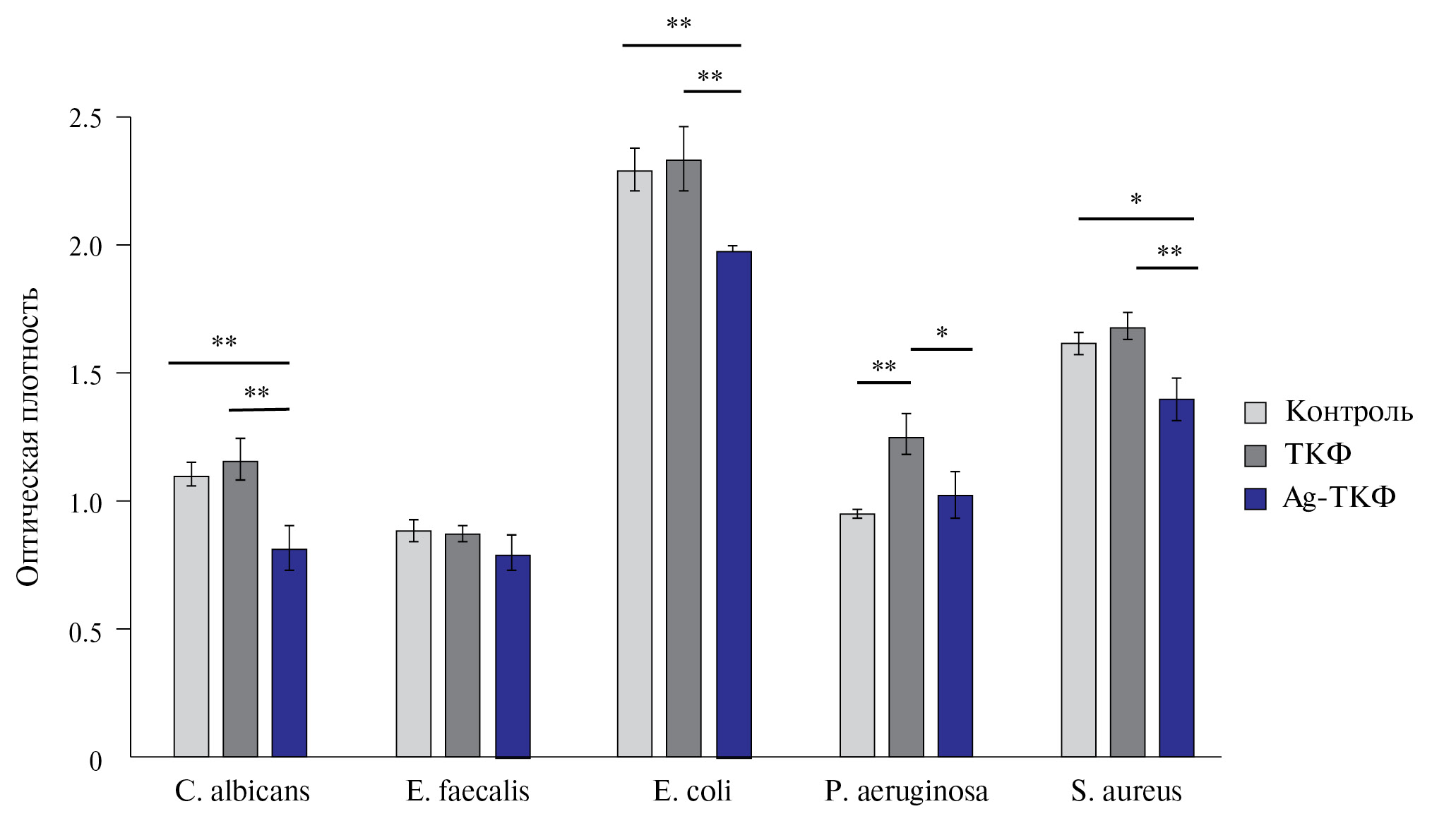 Рис. 1. Результаты антимикробных испытаний культур четырех бактериальных возбудителей и гриба C. albicans на пластинках Ti в присутствии и в отсутствие (CTR-контроль) Ag-TКФ или TКФ [12].
