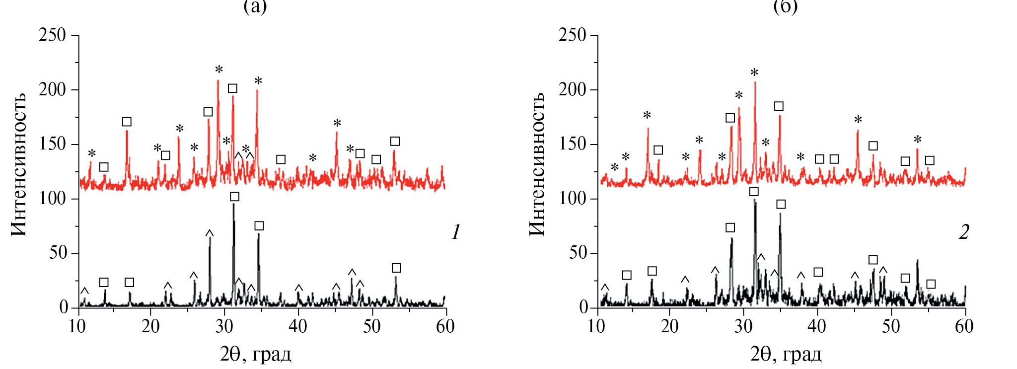 Рис. 7. Дифрактограммы цементов на основе TКФ (а) и Zn-ТКФ (б) до (1) и после (2) выдерживания в физиологическом растворе: * – β-Ca3(PO4)2 (TКФ) (card [09–169]), – CaHPO4·2H2O (брушит) (card [72–713]), ^ – Ca10(PO4)6(OH)2 (ГА) (card [72–1243]) [21].