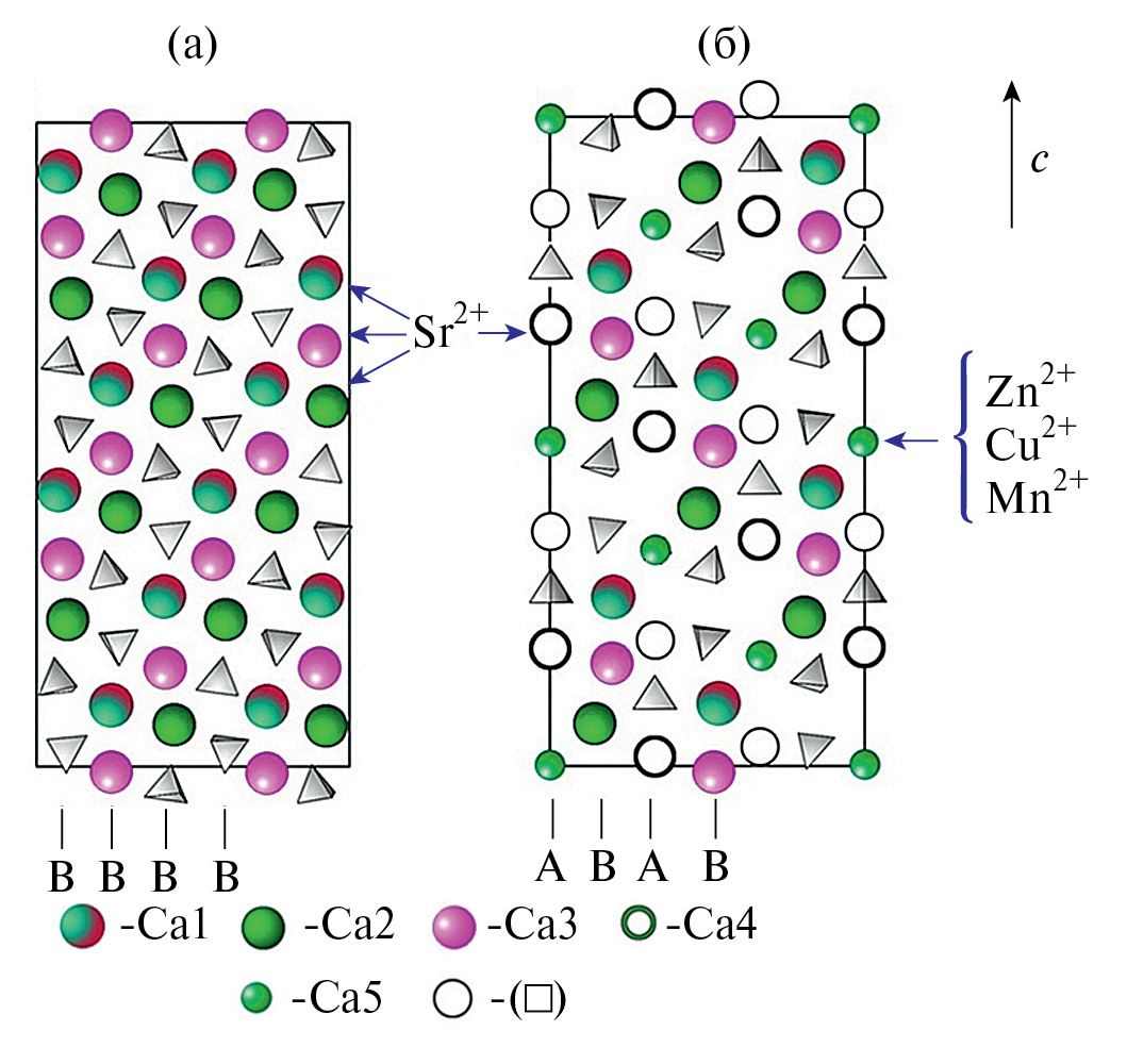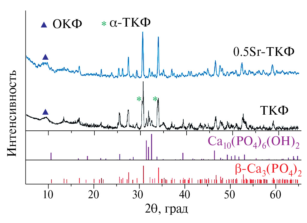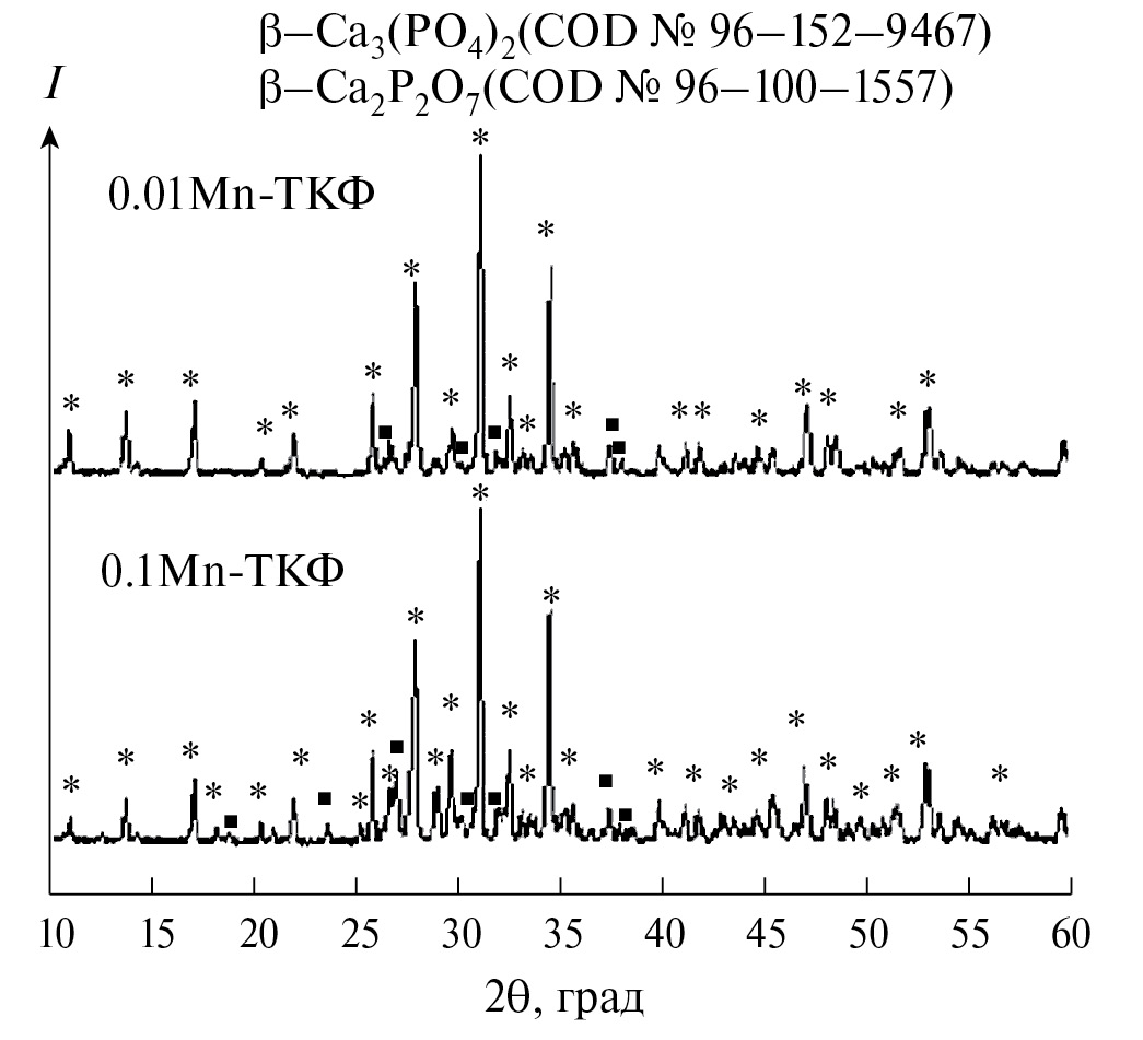 Интерес к катион-замещенным фосфатам кальция возрос в последние годы в связи с тем, что их активно используют для изготовления материалов медицинского назначения для восстановления костных тканей, поврежденных в результате травм и обширных операций, связанных с частичной утратой кости. Наиболее перспективным является регенеративный подход к лечению, в результате которого организм самостоятельно восстанавливает утраченные фрагменты костной ткани [1]. Наиболее важным аспектом является скорость биорезорбции матрикса, которая должна быть сравнима со скоростью образования новой костной ткани. Показано [2], что материалом матрикса, наиболее подходящим по скорости биорезорбции, является трикальцийфосфат (ТКФ, Ca3(PO4)2). Скорость резорбции ТКФ в организме превосходит скорость резорбции гидроксиапатита [3], однако все же оказывается меньше скорости образования новой костной ткани. Увеличить скорость биорезорбции керамики из ТКФ можно несколькими способами: уменьшением размера зерна керамики с одновременным увеличением пористости или химической модификацией ТКФ, а именно частичным замещением ионов кальция в структуре ТКФ на катионы других элементов. В результате такого замещения в кристаллической решетке ТКФ возникают локальные напряжения, приводящие к ее деформации и увеличивающие скорость резорбции замещенного ТКФ [4–7]. Кроме того, присутствие в материале допирующих ионов придает материалу полезные свойства. Так, благодаря присутствию ионов с антибактериальными свойствами – серебра, цинка, меди, железа, марганца, церия, гадолиния, силиката, перманганата, ванадата – материал приобретает антибактериальную активность. Материалы из стронций-замещенного ТКФ улучшают клеточную пролиферацию на их поверхности. В последние годы были получены и охарактеризованы двойные замещенные ТКФ, в которых каждый из допирующих ионов вносит свой вклад в модификацию свойств ТКФ.