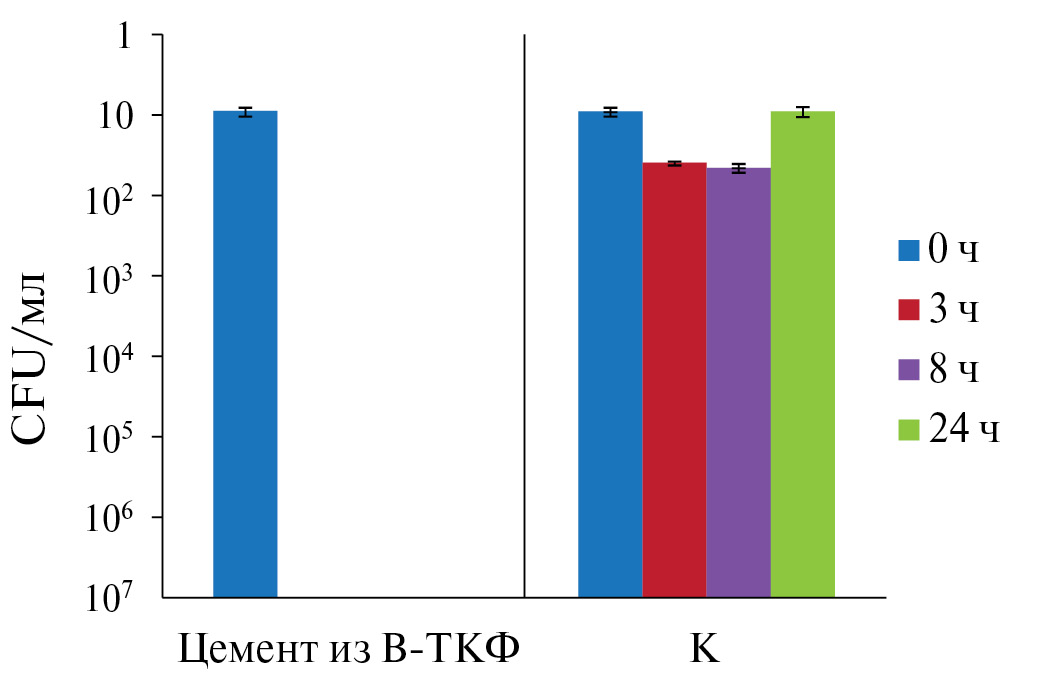 Цемент на основе Cu-ТКФ проявлял антибактериальный эффект, хотя и исключительно в отношении грамотрицательных бактерий, включая E. coli, P. aeruginosa и S. enteritidis (рис. 12). Этот антибактериальный эффект был обусловлен ионами меди, о чем свидетельствует отсутствие антибактериального эффекта у цемента, не содержащего меди. Кроме того, антибактериальная активность медьсодержащего цемента была значительно выше, чем у порошка-предшественника. Поскольку не было существенной разницы между кинетикой высвобождения меди из порошка TКФ-предшественника и из конечной, брушитовой, фазы затвердевшего цемента, это позволяет предположить, что антибактериальный эффект был обусловлен не только ионами меди, но и синергией между катионной медью и определенной фазой и агрегатным состоянием ФК.