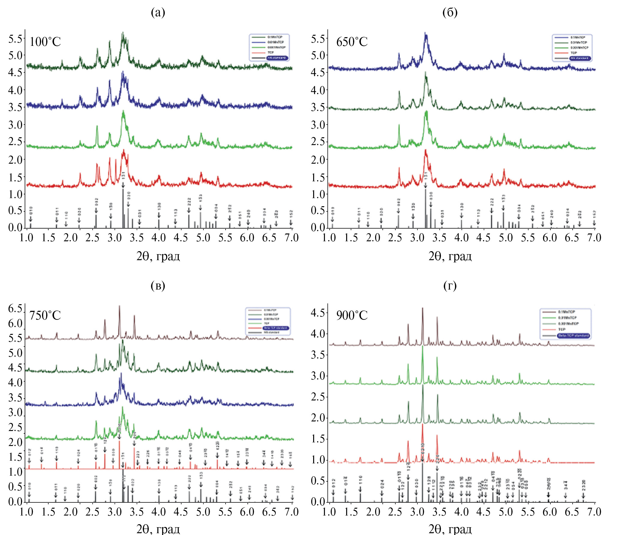 Ионы меди остались в фильтрате в виде тетраамминокупрат-ионов. Полученное в результате синтеза соединение Cu-TКФ может быть представлено брутто-формулой Ca2.984Cu0.016(PO4)2. Это означает, что только один из ~180 атомов кальция был заменен на медь. Такая степень замещения ниже, чем обычно наблюдаемая в ГА, также из-за меньшей восприимчивости к вакансиям и деформации решетки TКФ. На рис. 11 показаны результаты рентгенофазового анализа. Все пики на двух дифрактограммах относятся к витлокиту, основной фазе после прокаливания при 900°C. Небольшое смещение всех дифракционных пиков к большим углам по шкале 2θ подтверждает гипотезу о замещении ионов кальция на ионы меди, поскольку коррелирует с меньшими межплоскостными расстояниями и меньшим объемом элементарной ячейки, что согласуется с меньшим размером ионов меди по сравнению с ионами кальция.