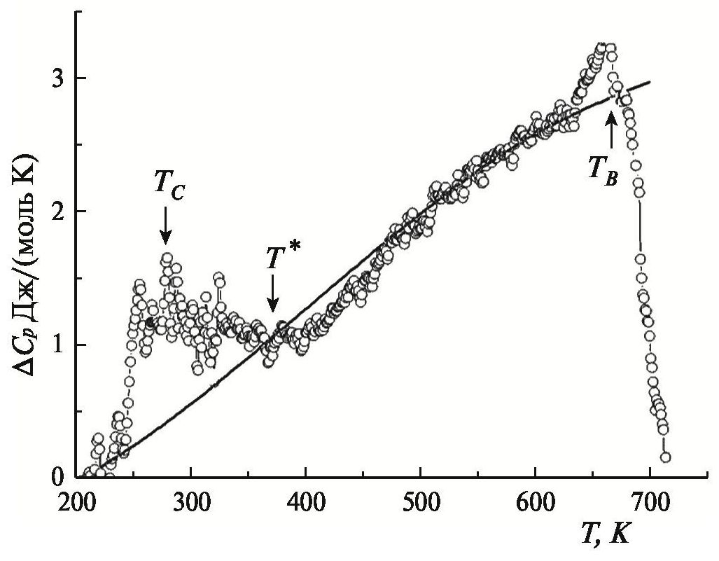где v – число молей вещества, R – универсальная газовая постоянная, D1 и D2 – отношение кратностей вырождения уровней. Путем сравнения теплоемкости, рассчитанной по формуле (2), и экспериментально выделенной аномальной теплоемкости ∆C получены модельные параметры: D1 = 1.257, D2 = = 29.435 и ∆E1 = 0.324, ∆E2 = 0.933 эВ. Согласие экспериментально полученной теплоемкости ∆C(T) с расчетной кривой зависимости аномальной теплоемкости от температуры по формуле (2) достаточно хорошее (рис. 2).