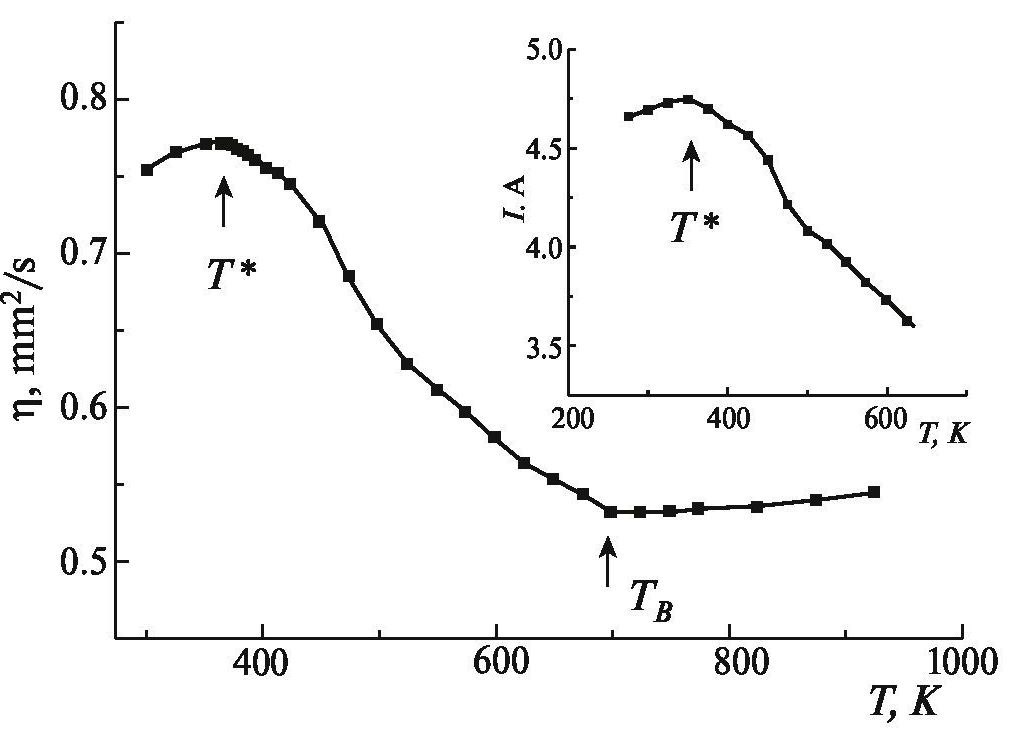 На рис. 3 и 4 приведены температурные зависимости термодиффузии η и теплопроводности λ образцов PFТ в интервале температур 290–800 К. На зависимостях η(Т) и λ(Т) наблюдается аномальное поведение в областях Т ≈ 380 К и ТB ≈ 690 К. Возможно, при T* ≈ 380 К происходит объединение нанополярных областей в более крупные и долгоживущие дипольные области, поскольку во всех известных релаксорных сегнетоэлектриках на основе Pb температура T* находится выше TС (ТB > T* > TС) в интервале 350–570 K (в ряде работ изменения при T* называют “наномасштабным фазовым переходом”) [17–19, 28].