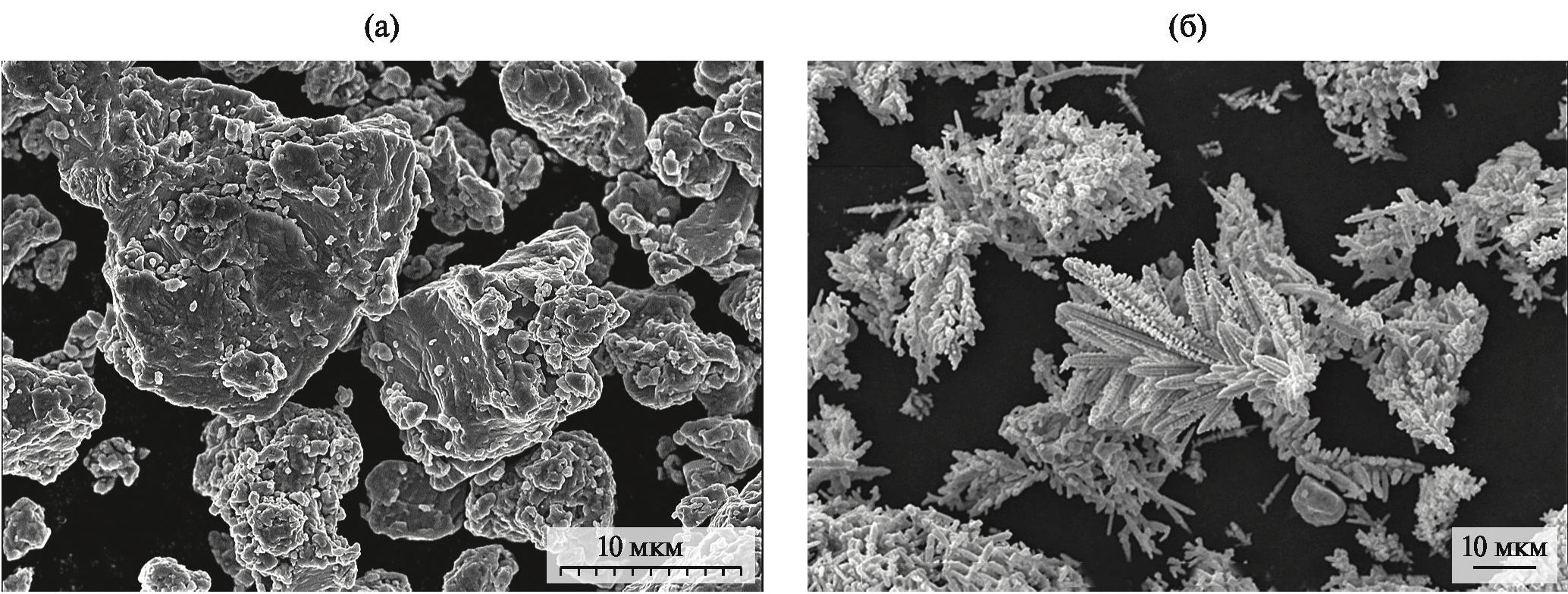 Рис. 2. Морфология исходных частиц ванадия(а), меди (б).