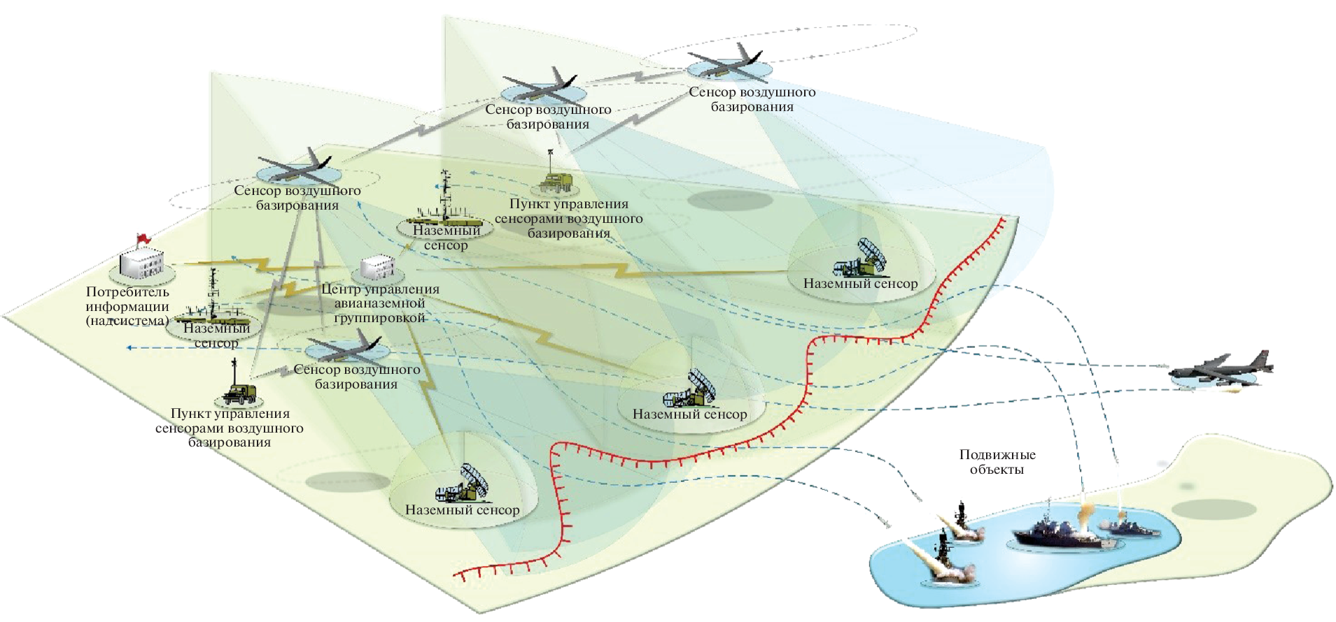 The steady growth in the scale and dynamics of the use of aerial weapons in the course of various conflicts necessitates the formulation and solution of the problems of building realistic systems to detect them. It should be noted that the priorities in the development of detection sensors is changing from solving problems to improve their characteristics to optimization and adaptability in controlling them. As an object, a heterogeneous grouping of sensors, which solves the problem of detecting a moving airborne object, is considered. The subject is the methodology for constructing control models for heterogeneous detection sensors. Based on the analysis of the antagonistic interaction of a heterogeneous grouping and airborne objects, as well as the processes of their functioning, a geometric approach to solve the problem of detecting a moving object (MO) is proposed, which uses an adapted and improved risk functional as one of the possible indicators for the further synthesis of the control algorithms. The practical effectiveness of the application of this functionality is substantiated and compared with other performance indicators through simulation modeling.