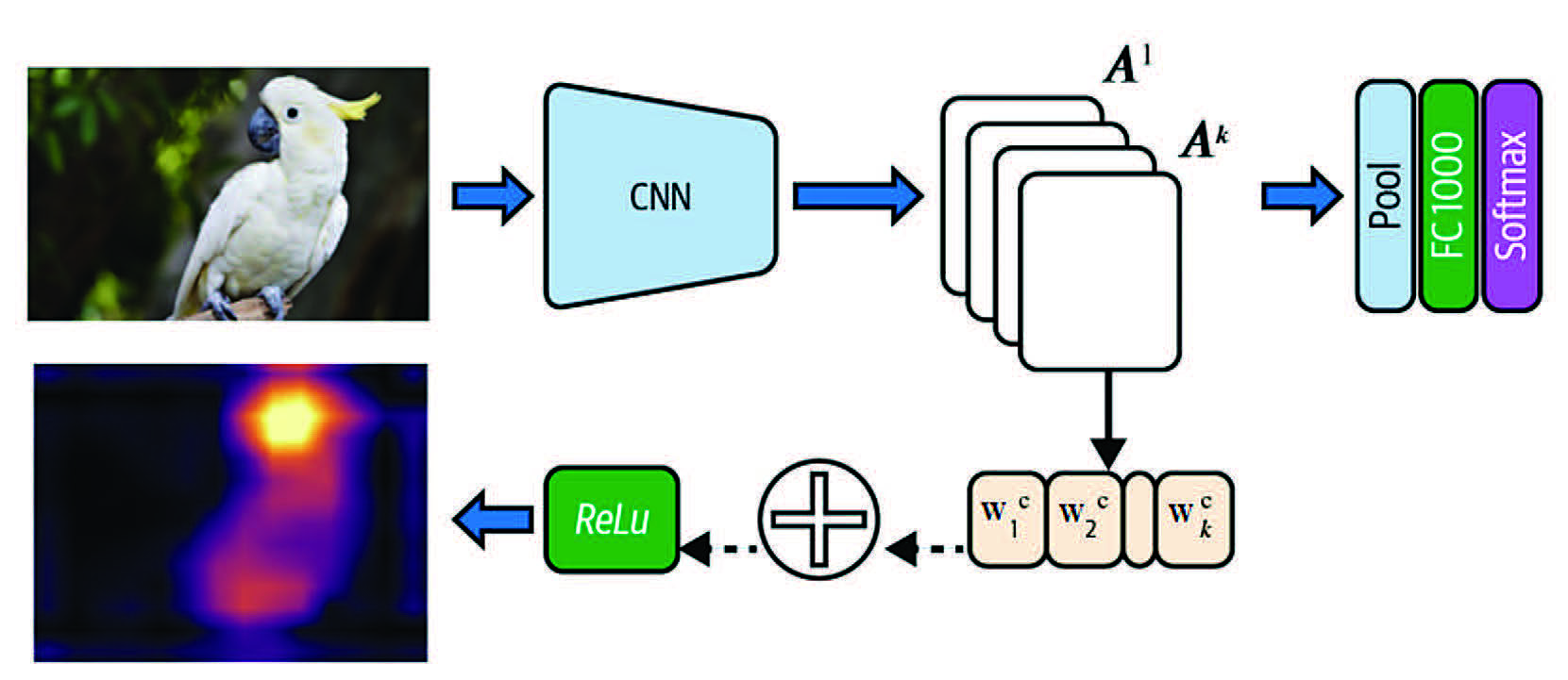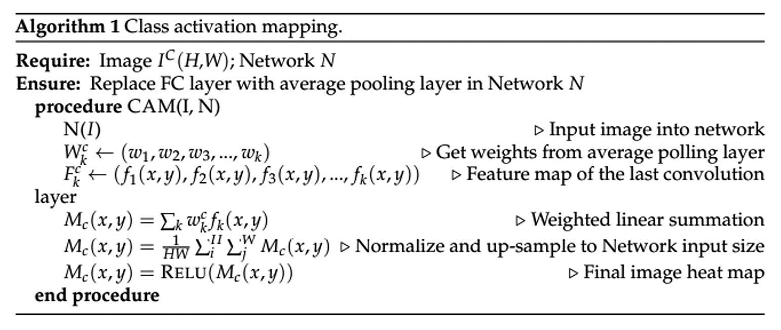 Использование CAM для работы с любой архитектурой ИНС представляет собой имплементацию метода к последнему сверточному слою. Для VGG-16 — это последний свёрточный слой пятого блока (Conv 5-3). Размерность этого слоя свертки составляет i × j × 512, где i и j — размерность свёртки, а 512 — количество каналов (карт признаков — Ak), сопоставленных с метками классов набора данных для обучения. Так, для VGG-16, обученной на наборе данных ImageNet, количество меток составит 1000.