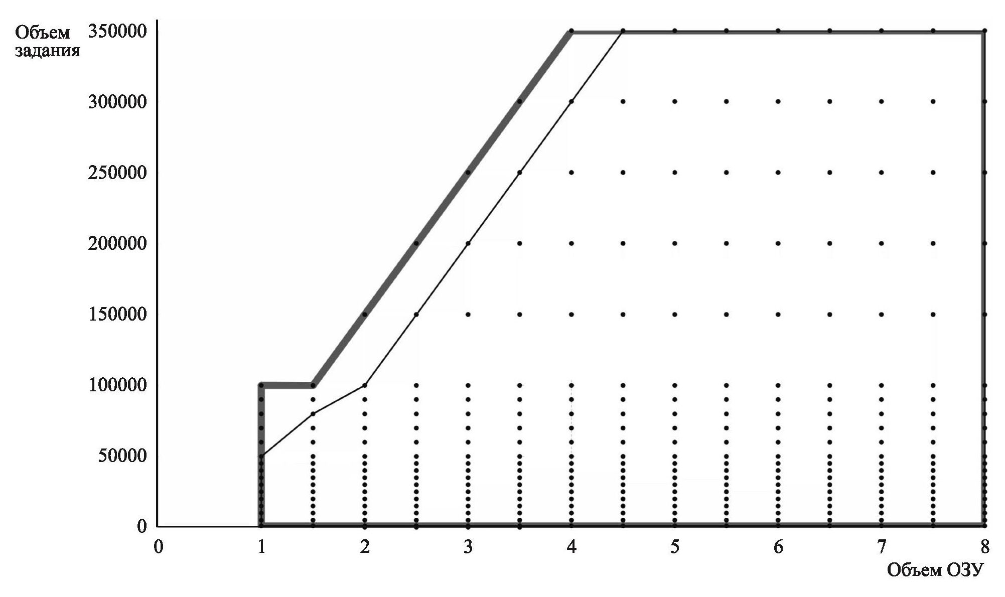 На нем точками обозначены пары “объем ОЗУ – объем задания” , испытания с заданной парой проводились для всех возможных вариантов количества процессорных ядер: от 1 до 4. Жирной серой линией обведена вся область аргументов , для которых проводилось тестирование. Черная линия показывает границу эффективного функционирования узла.