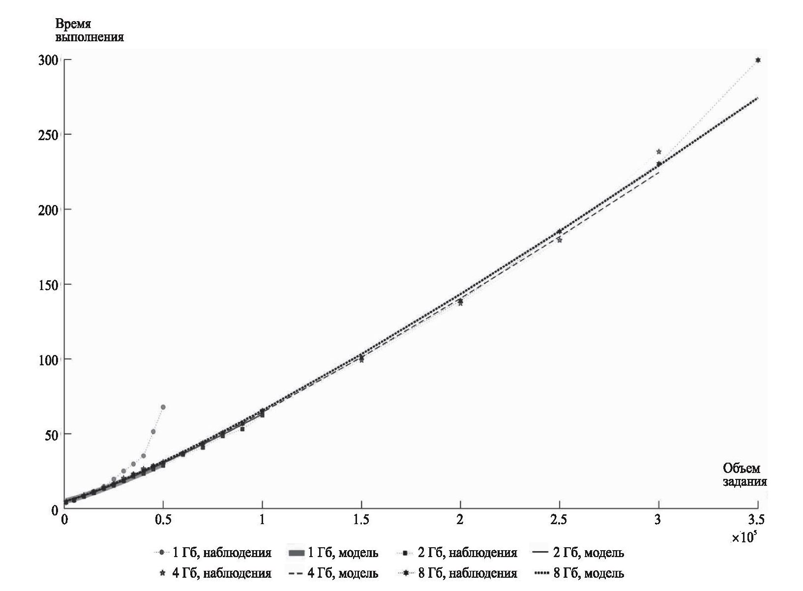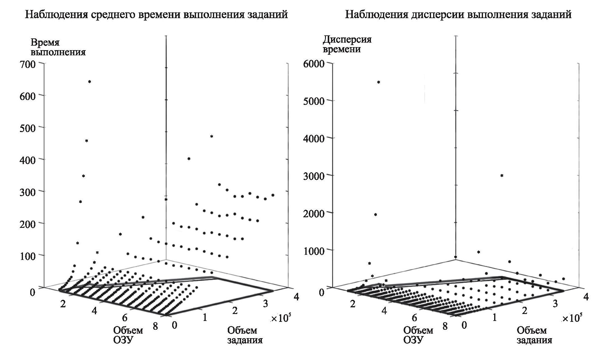 Анализ данных рисунков ведет к следующим заключениям. Начиная с объема ОЗУ 4,5 Гб все задание умещается в него, и механизм свопинга, существенно задерживающий процесс выполнения заданий, в этом случае не используется. По этой причине на рис. 3 и 7 можно заметить практически постоянное среднее время, не зависящее от объема ОЗУ, для заданий объемом до 250 000. В то же время для объемов 300 000 и 350 000 наблюдения демонстрируют некоторый рост среднего времени выполнения заданий с ростом объема ОЗУ. Заметим, что оцененный показатель степени при мал по модулю (равен 0.03), но имеет положительный знак. Таким образом, построенная модель среднего времени не обладает свойством локального невозрастания по переменным , описывающим ресурсы узла, т.е. имеет место нарушение свойства 2 из [1]: выбранная модель среднего времени, идентифицированная по полученным наблюдениям, строго возрастает с ростом ресурса . Для этого имеются две причины. Во-первых, задачи оптимизации (2.4) и (2.5), решаемые для идентификации параметров моделей и , не содержали ограничений на переменные , : введение дополнительных ограничений обеспечило бы выполнение свойства 2 из [1]. Во-вторых, класс функций , и , выбранный для описания модели, недостаточно гибок для описания свойства 2 из [1]. Для наблюдений выборочной дисперсии и ее модели, построенной по данным нагрузочных испытаний, ситуация иная: для заданий большого объема (300 000 и более) наблюдается тенденция к снижению дисперсии с ростом ОЗУ. Построенная модель отражает эту тенденцию: показатель степени при хотя и относительно мал по абсолютной величине, но имеет отрицательный знак: . По данным рисункам можно сделать следующий качественный вывод. На некоторых областях рост какого-либо ресурса (в данном случае объема ОЗУ) может нисколько не снижать среднее время выполнения задания, но в некоторых случаях даже увеличивает его.