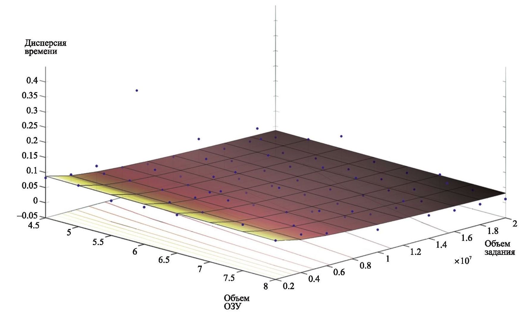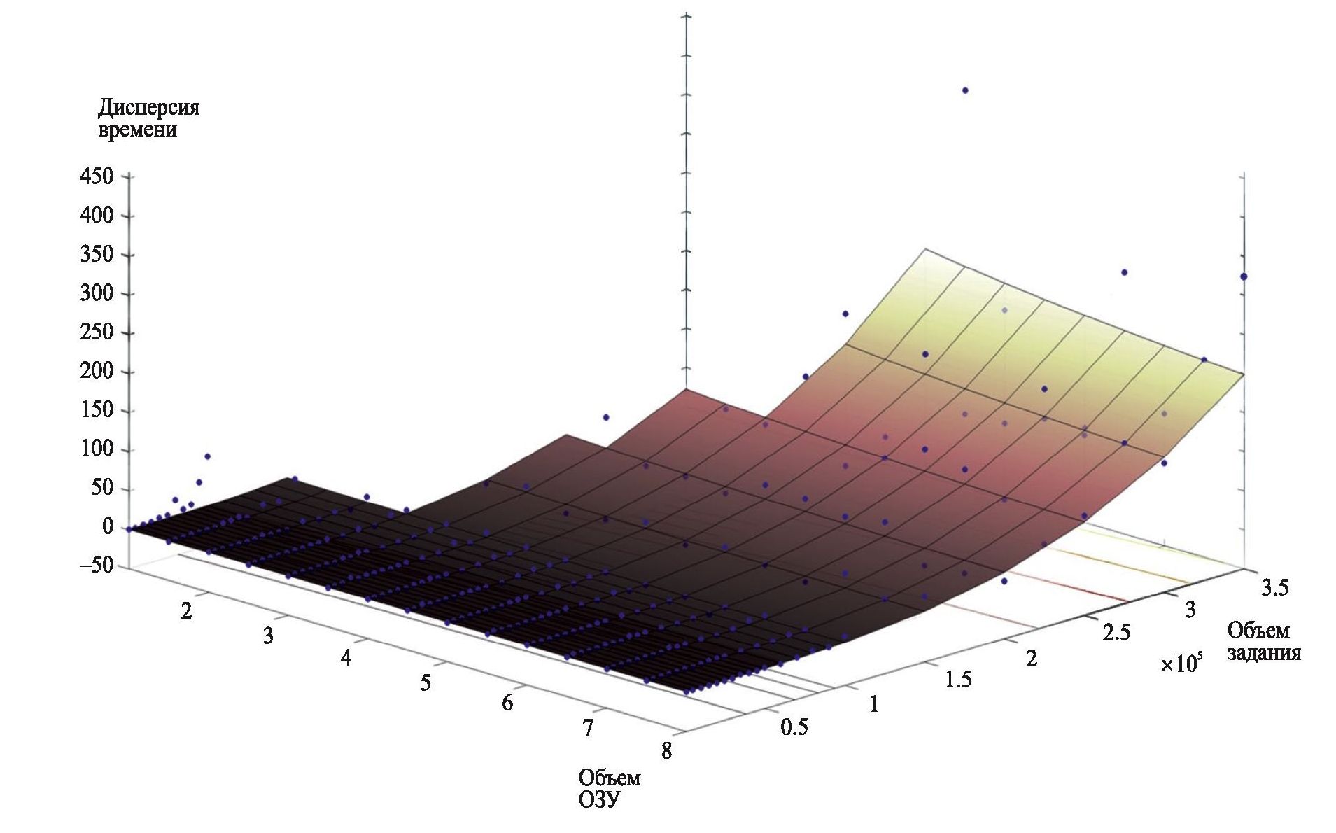 Анализируя рис. 3 и 4, можно сделать следующие заключения. Во-первых, невязки модели дисперсии значительно больше невязок модели среднего времени. Во-вторых, в области малого объема ОЗУ можно увидеть резкий рост как среднего, так и дисперсии времени выполнения задания даже при малом его объеме. Именно это обстоятельство вынудило сократить область возможных значений ресурсов узла, обеспечивающих эффективное выполнение пользовательских заданий № 1. Причиной такого замедления и нестабильной работы является недостаток оперативной памяти и активное использование механизма свопинга.