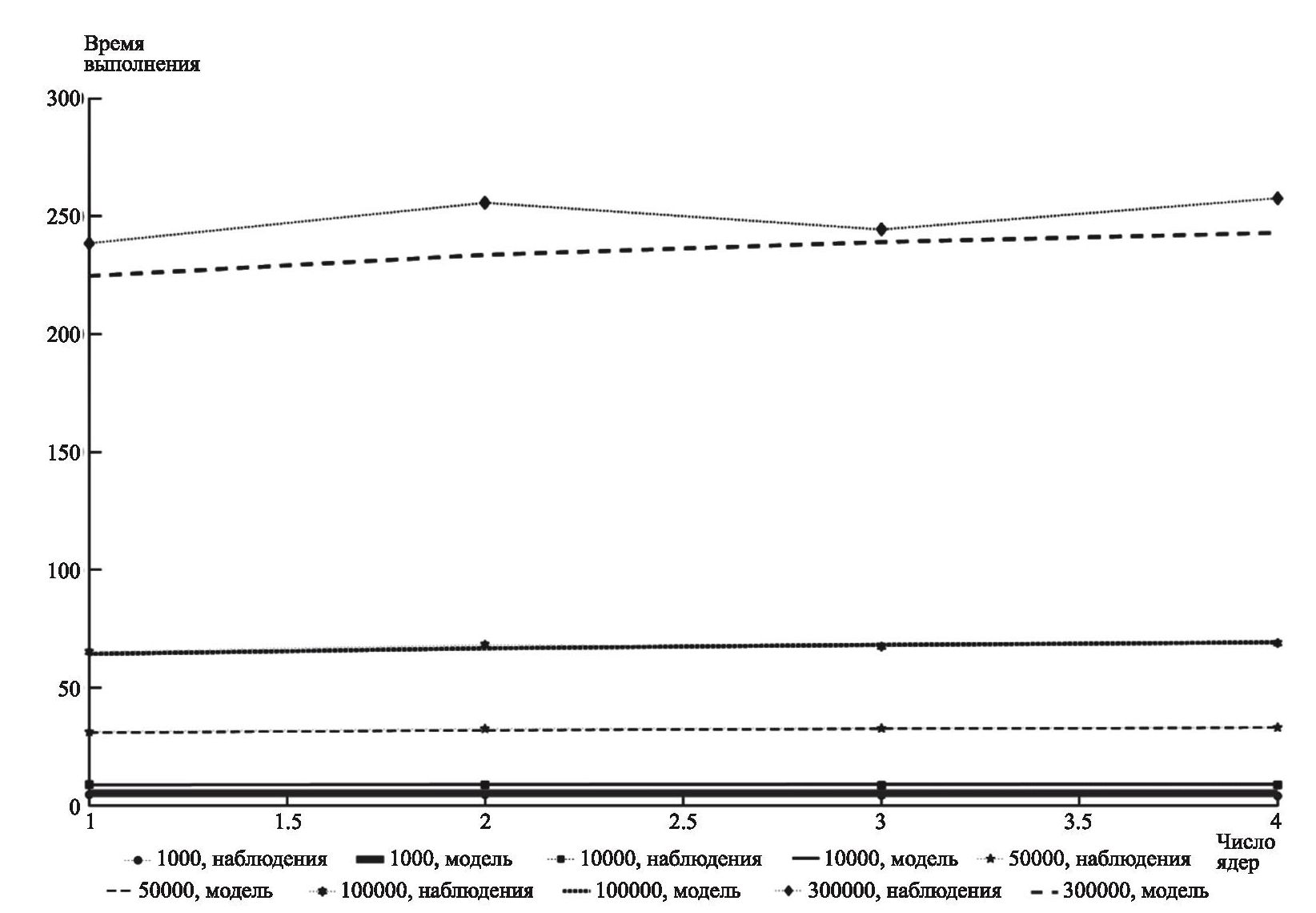 Примечательно, что число процессорных ядер не влияло на характеристики трудоемкости выполнения задания 1. Это означает, что задание 1 не допускает распараллеливания. Для задания 2, напротив, увеличение количества используемых ядер значительно снижает как среднее время выполнения задания, так и его дисперсию. Данный факт вполне объясним, потому что процедура вычисления выборочной ковариации содержит в себе ряд операций, допускающих практически полное распараллеливание. Не зная кода данной процедуры, можно предположить, что на первом шаге выполняется выбор данных, подлежащих последующему осреднению. Эти операция, по-видимому, не может быть распараллелена эффективно. Второй шаг, собственно, заключается в вычислении выборочной ковариации, и эта операция допускает практически “полное” распараллеливание: для вычисления выборочной ковариации по выборке объемом  можно задействовать от 1 до 16 процессорных ядер. На третьем шаге происходит окончательное вычисление ответа, когда процесс – сборщик собирает и совместно обрабатывает результаты рабочих процессов, задействованных в распараллеливании. Бо́льшее число ядер позволяет запустить бо́льшее число рабочих процессов одновременно. Так как не все операции доступны распараллеливанию, среднее время выполнения задания уменьшается не кратно числу используемых ядер, а медленнее.