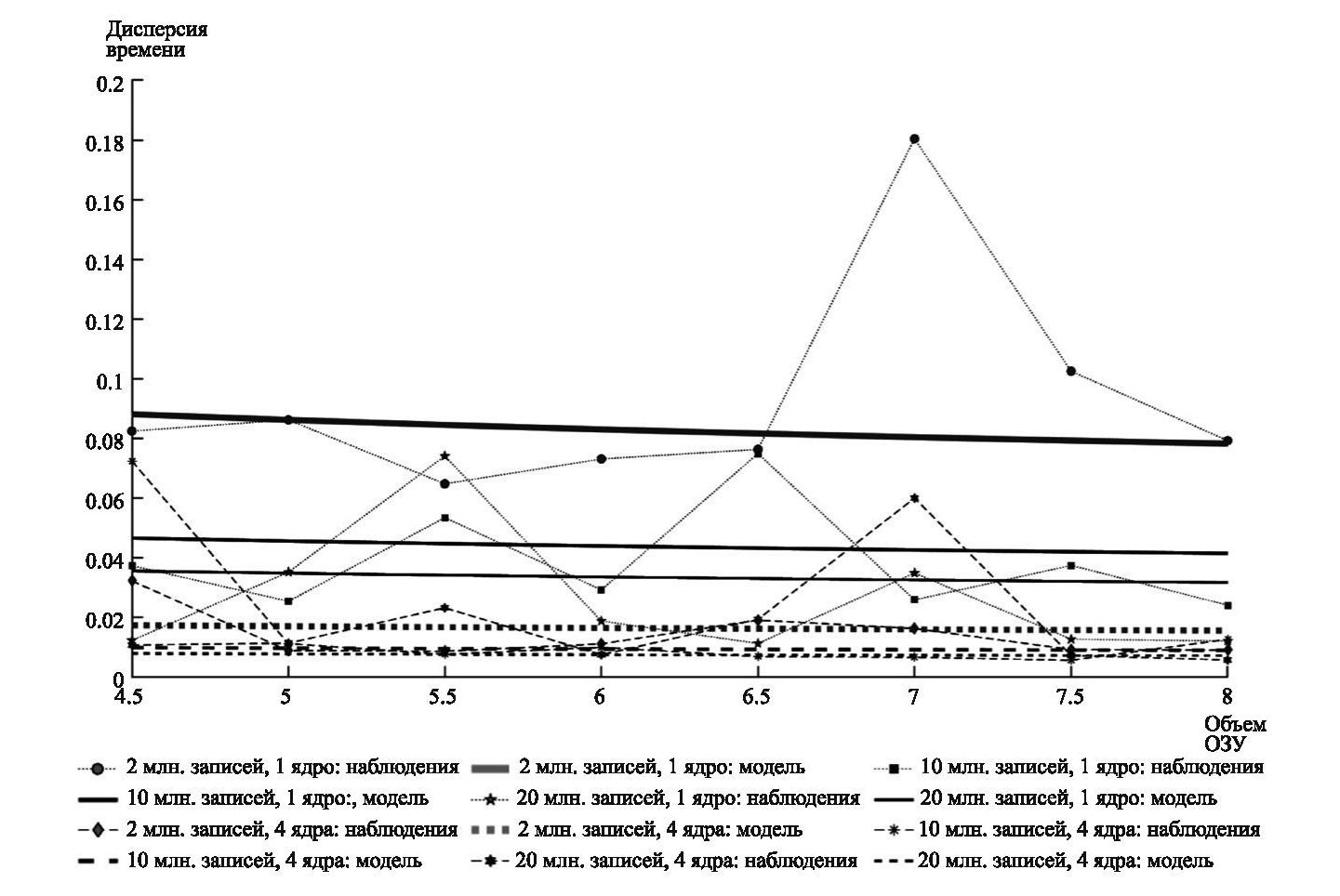 На рис. 18 и 19 представлена зависимость среднего времени и дисперсии выполнения задания от числа ядер для различных фиксированных объемов ОЗУ и размеров задания. На рисунках ломаными с маркерами показаны результаты нагрузочного тестирования, кривыми – построенная модель.