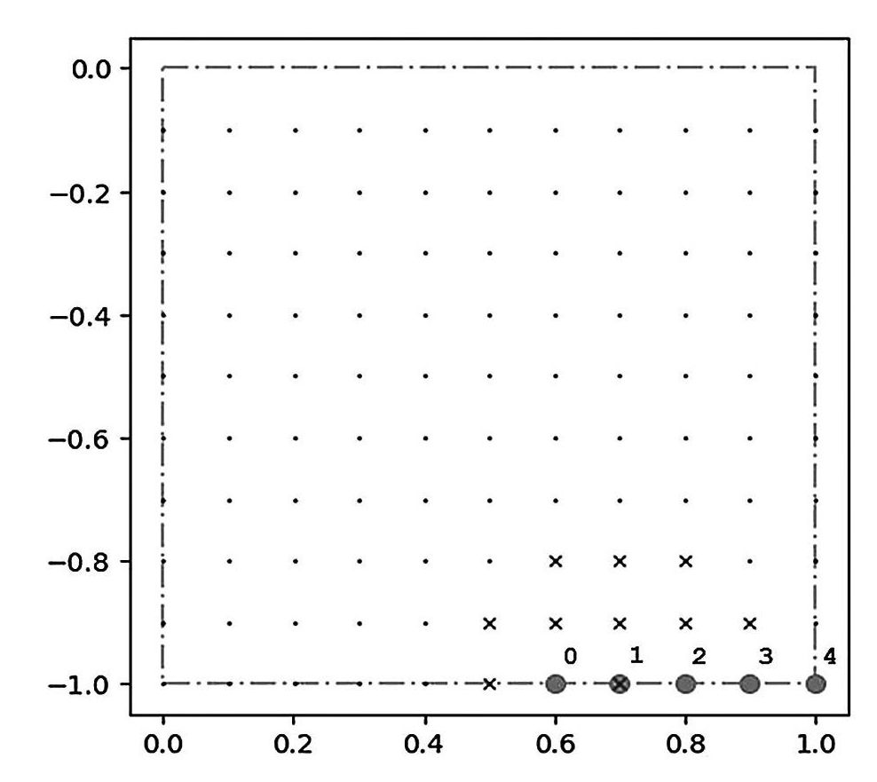 - Поиск размещения пунктов ТИС. Пусть – измерительные пункты ТИС, где , . Рабочая область – это регион, в котором ожидаем появление целей. Задача состоит в поиске размещения пунктов ТИС, при котором будет обеспечено корректное наблюдение целей, расположенных в рабочей области. Используя обозначения из [21], определим игру , где – множество игроков (агентов), – множество совместных действий агентов, причем – множество действий, доступных i-му агенту, – множество функций полезности, где – функция полезности i-го агента. Вектор – коллективные действия агентов (пунктов наблюдения), будем писать , где , где – действие i-го пункта, а – действия остальных пунктов, исключая i-й. Задача решается в дискретном варианте, для этого покрываем области размещения пунктов и целей сеткой: – узлы сетки на P, – узлы сетки на S. Набор действий (позиций для перемещения), доступных i-му агенту в момент времени t, зависит от его текущей позиции и выбирается из некоторой ее окрестности. Радиус окрестности определяется константой , которая характеризует возможности перемещения агента за один шаг игры. При этом , т.е. агент может выбрать действие, в результате которого он останется в текущей позиции. Например, на рис.1 маркером отмечены доступные позиции для перемещения агента №1 для параметра .