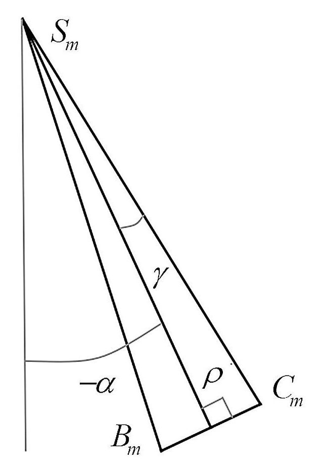 - Задача противоборства наблюдателя и противника. Пусть – измерительные пункты ТИС, где , . – пункты СПП, где , , – высота треугольника помех, – половина угла при вершине треугольника помех, – угол поворота сектора помех m-го пункта (угол считается от отрицательного направления оси абсцисс). Характеристиками пункта СПП являются угол и дальность (будем считать, что характеристики всех пунктов одинаковые). Угол характеризует сектор, в котором пункт может обеспечить помеху заданного уровня, а дальность – максимальное удаление от пункта в пределах сектора, для которого также сохраняется заданный уровень излучаемой помехи. Считаем, что область постановки помехи – равнобедренный треугольник, одна из вершин которого совпадает с положением соответствующего пункта, координаты двух оставшихся вершин (рис. 2)