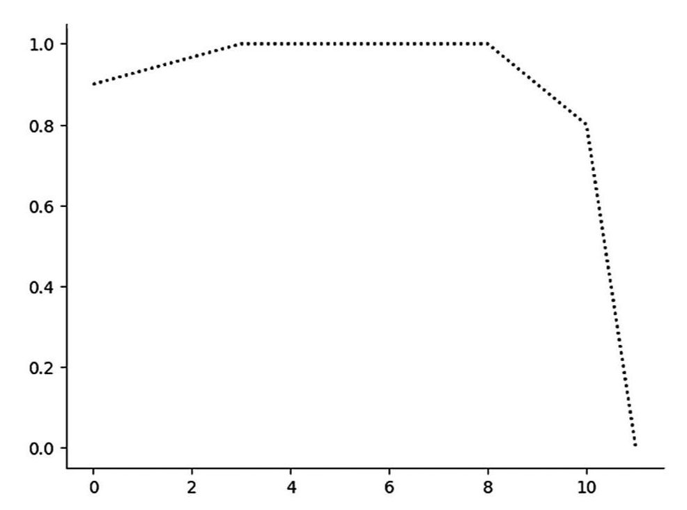 При условии 3.3 и противник, и наблюдатель для решения своих задач должны осуществлять перемещение пунктов, поскольку у наблюдателя не существует устойчивой к помехам конфигурации ТИС, а у противника нет такой конфигурации, которая может вывести из строя любую ТИС. Противник на основе множества эффективных конфигураций H ищет такие комбинации конфигураций (пары, тройки и т.д.), реализация которых позволяет вывести из строя любую ТИС из G. Выбирает комбинацию, которая обеспечивает минимальное время перехода между конфигурациями. Применяет конфигурации из выбранной комбинации до нарушения работы ТИС. Наблюдатель перемещает пункты ТИС с целью обеспечения работоспособности. При перемещении пунктов ТИС или СПП, кроме расстояния между позициями, следует учитывать следующие параметры: время на приведение пункта ТИС из рабочего состояния в транспортное, т.е. подготовка к перемещению, скорость перемещения пункта ТИС, время на приведение пункта ТИС из транспортного состояния в рабочее, работоспособность обслуживающего персонала. Кривая работоспособности персонала пункта может выглядеть, как на рис. 3. Поскольку в составе одной ТИС/СПП могут использоваться различные пункты, то благодаря их характеристикам указанные выше значения могут существенно различаться. Кривая работоспособности учитывает квалификацию экипажа и влияние усталости на эффективность работы в зависимости от времени, затраченного на перемещение пункта. Время перемещения пункта p с позиции i в позицию j определяется по формуле , где – расстояние между пунктами, – скорость перемещения пункта, – время подготовки пункта к перемещению, – время подготовки пункта к работе, – функция работоспособности экипажа пункта. Отметим, что наблюдатель решает задачу поиска новой ближайшей позиции ТИС, принадлежащей множеству безопасных конфигураций, с учетом характеристик каждого агента, исходя из критерия минимизации величины . Для противника же не стоит задача поиска ближайшей позиции, поскольку он должен реализовать все конфигурации комбинации.