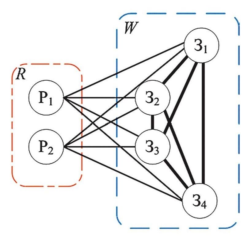 Решение NP-полных задач с помощью нейросетевых методов широко практикуется для задач TSP-класса [19]. Для преобразования исходной задачи к задаче TSP-класса введем фиктивные переходы между заданиями и работами на поле, а также между точками расположения роботов с нулевым весом. В конечной точке траектории i-го робота необходимо замкнуть его маршрут через фиктивный путь i+1 робота. При этом вершину маршрута последнего робота N необходимо замкнуть на вершину первого робота (N = 1). Это позволяет построить граф, содержащий гамильтонов цикл, являющийся одним из вероятных решений.