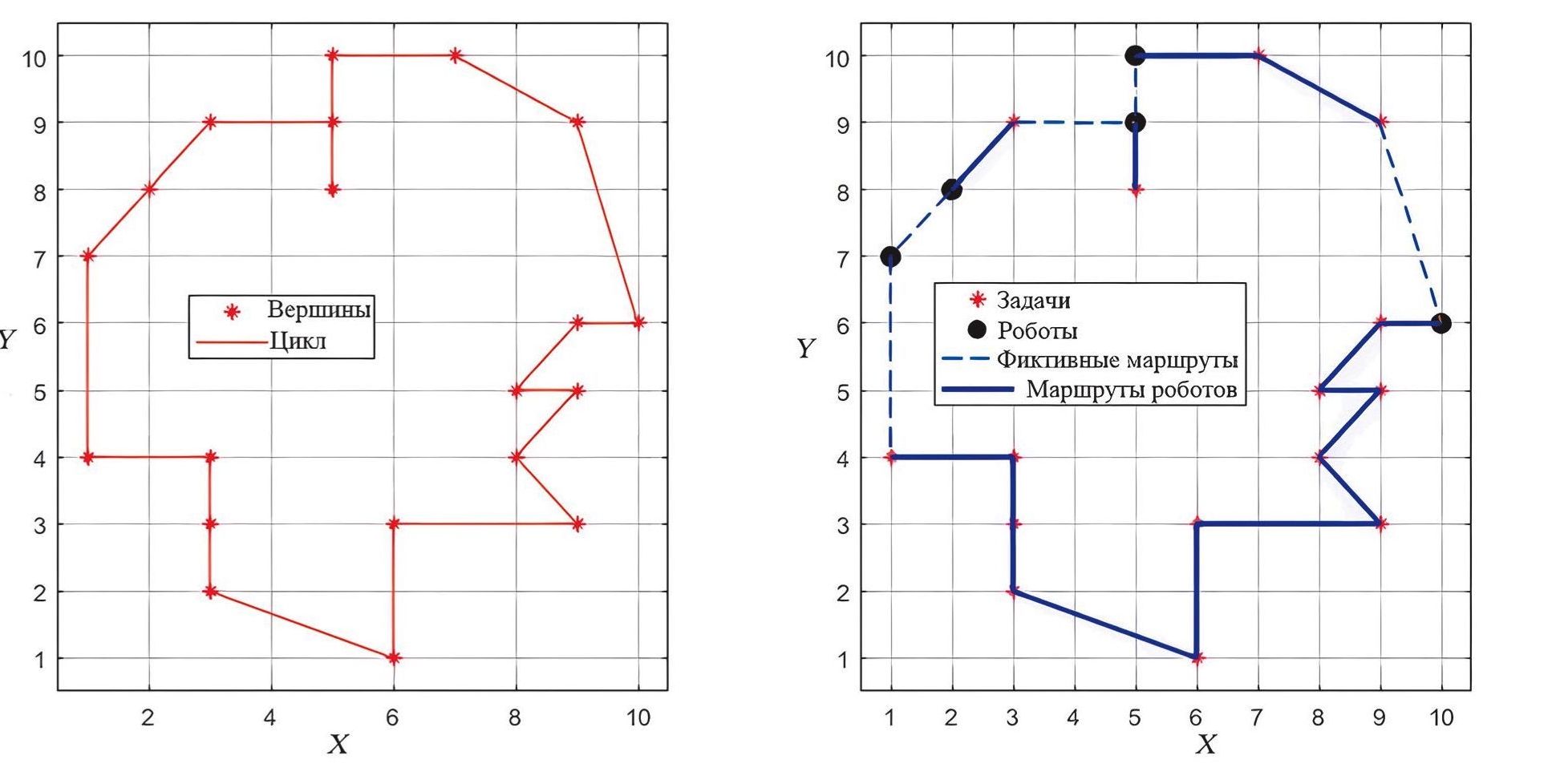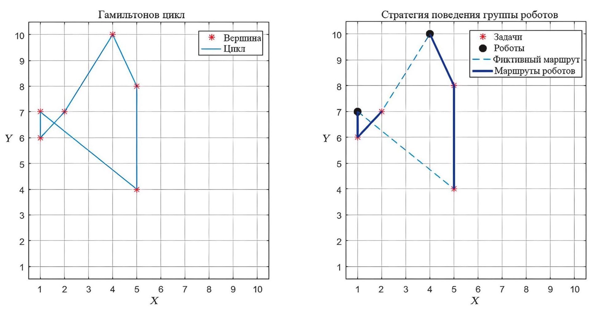 В качестве тестовой задачи используем задачу с размерностью поля 10х10 и числом объектов N = 20 (5 роботов, 15 заданий). Отображение исходных данных (гамильтонов цикл и стратегия поведения группы роботов) показано на рис. 5.