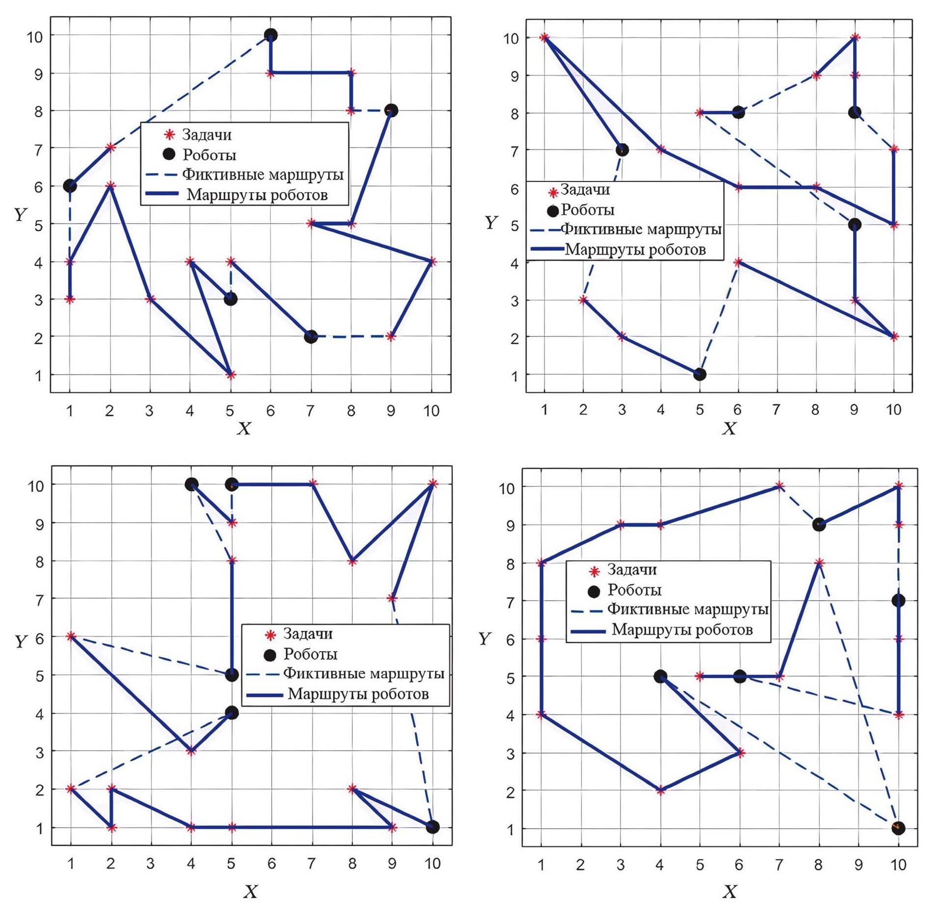 Среди подходов решения исследуемой проблемы следует отметить алгоритмы централизованного распределения задач [7], мультиагентные алгоритмы управления, использующие нечеткую логику [8], алгоритмы динамического программирования [9], потенциальные поля [10] и когнитивно-адаптивные методы [11]. Также показывают свою эффективность эволюционные подходы на основе генетических и муравьиных алгоритмов [12].