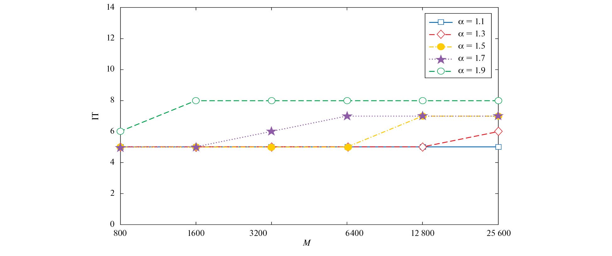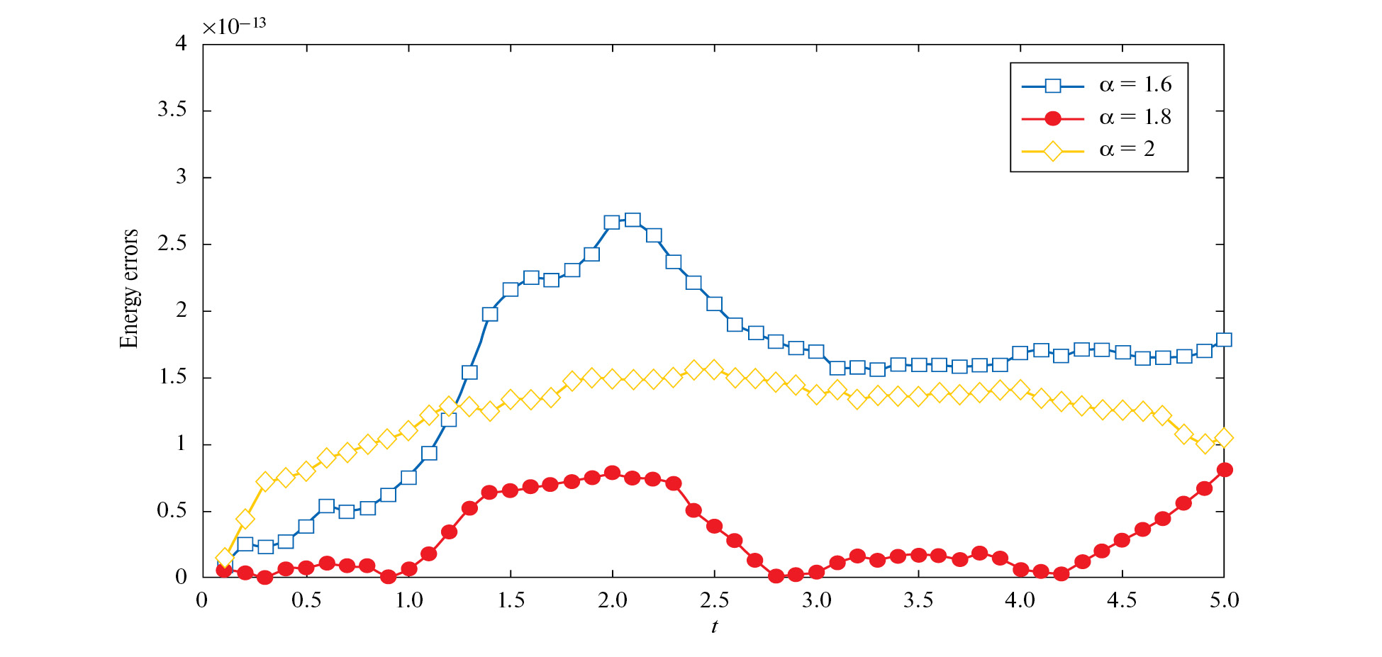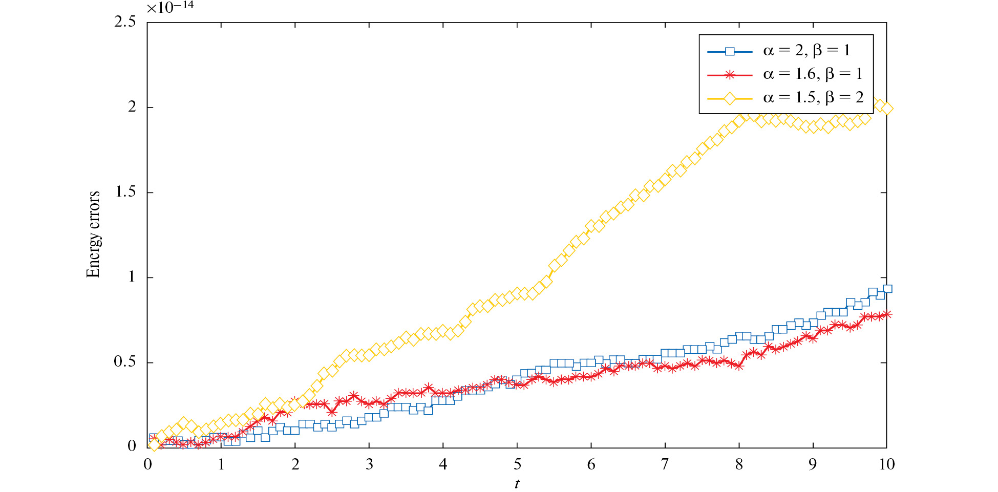 Таблицы 9, 10 и рисунок 13 сообщают об относительных ошибках дискретной массы и энергии. Соответствующий размер пространственной сетки и размер временного шага составляют h = 0.1, τ = 0.01. На каждом временном уровне блочные линейные системы, связанные с u и v, решаются с помощью CNAS-GMRES и прекращаются, когда относительные невязки блочных линейных систем по ℓ2-норме уменьшаются ниже 10−15. Небольшие ошибки, показанные в табл. 9, 10 и на рис. 13, показывают, что как дискретная масса, так и энергия схемы LICD сохраняются линейным решателем CNAS-GMRES при < α = 2, β = 1 >, < α = 1.6, β = 1 > и < α = 1.5, β = 2 >.