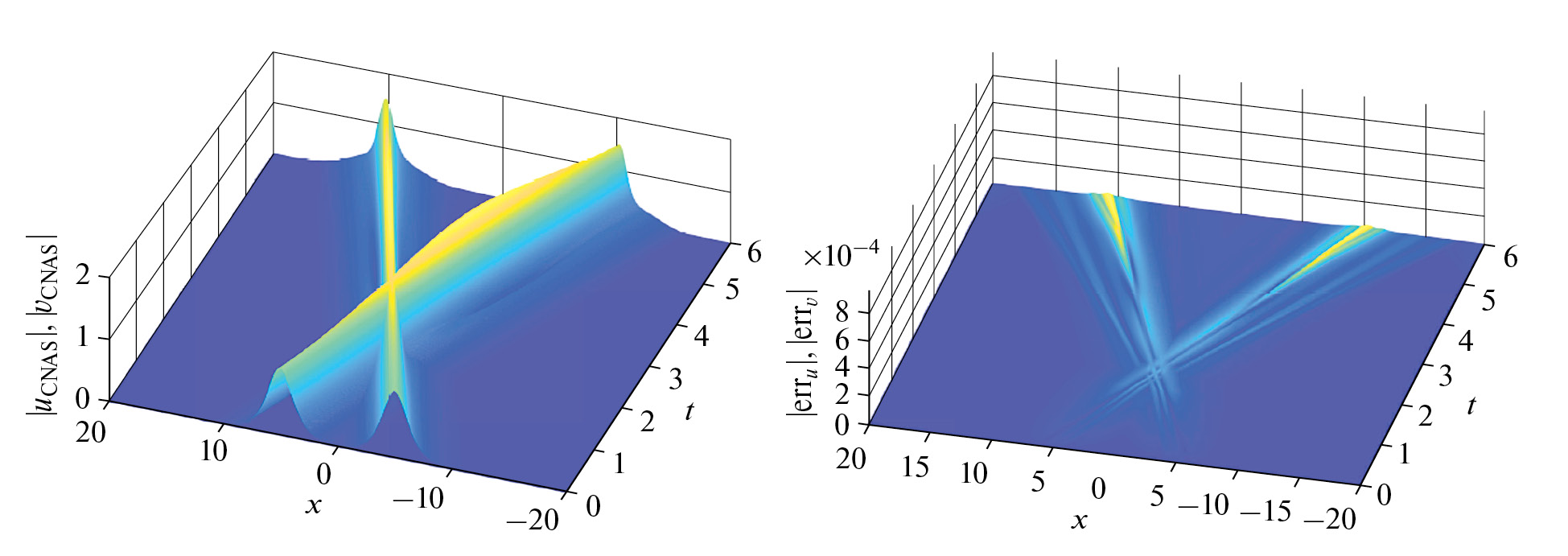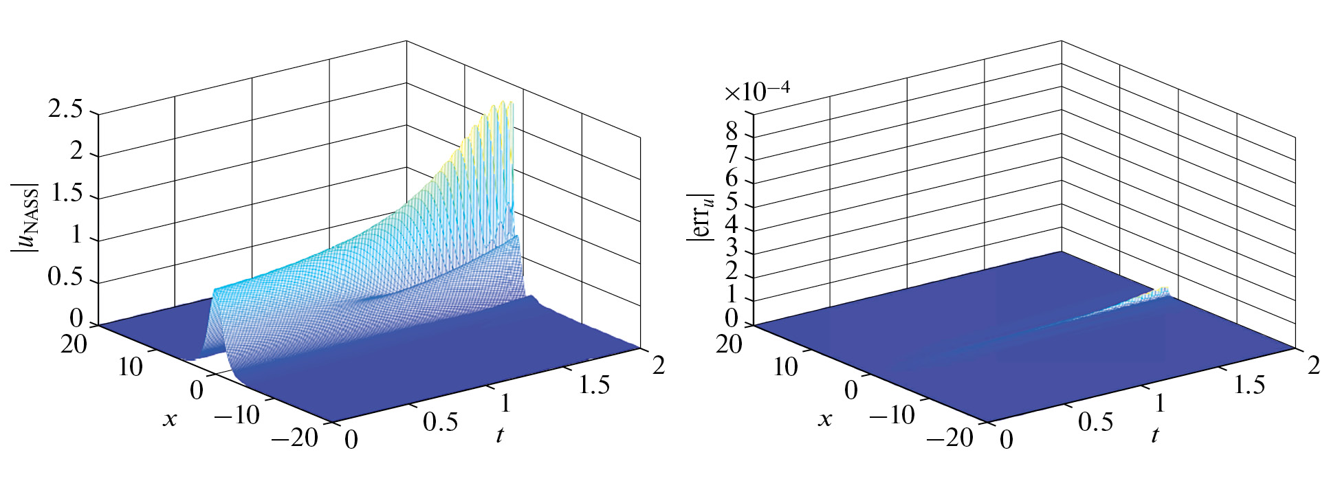 Рис. 17. Численные решения (слева) и их ошибки (справа) дробно-пространственных уравнений CNLS (5.3) при α = 2, M = 800, N = 600