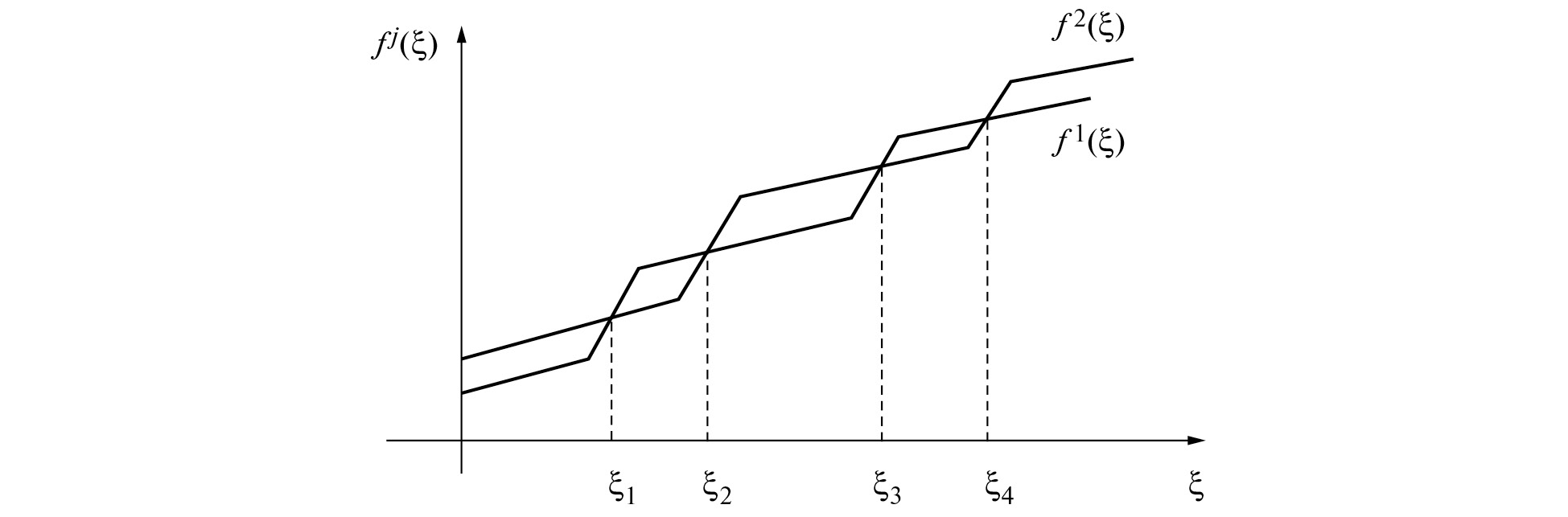 Тогда есть ξ * 0 MathType@MTEF@5@5@+= feaahGart1ev3aqatCvAUfeBSjuyZL2yd9gzLbvyNv2Caerbov2D09 MBdbqedmvETj2BSbqeeuuDJXwAKbsr4rNCHbGeaGqik8fkY=xipgYl h9vqqj=hEeeu0xXdi9arFj0xirFj0dXdbba91qpK0=yr0RYxfr=Jbb f9q8aq0=yq=He9q8qqQ8frFve9Fve9Ff0dmeaabaqaciaacaGaaeqa baqabeGadaaakeaaqaaaaaaaaaWdbiabe67a49aadaahaaWcbeqaa8 qacaGGQaaaaOGaeyyzImRaaGimaaaa@3672@ , при котором f 2   ξ * = f 1   ξ * MathType@MTEF@5@5@+= feaahGart1ev3aqatCvAUfeBSjuyZL2yd9gzLbvyNv2Caerbov2D09 MBdbqedmvETj2BSbqeeuuDJXwAKbsr4rNCHbGeaGqik8fkY=xipgYl h9vqqj=hEeeu0xXdi9arFj0xirFj0dXdbba91qpK0=yr0RYxfr=Jbb f9q8aq0=yq=He9q8qqQ8frFve9Fve9Ff0dmeaabaqaciaacaGaaeqa baqabeGadaaakeaaqaaaaaaaaaWdbiaadAgapaWaaWbaaSqabeaape GaaGOmaaaakmaabmaapaqaa8qacaa5GcGaeqOVdG3damaaCaaaleqa baWdbiaacQcaaaaakiaawIcacaGLPaaacqGH9aqpcaWGMbWdamaaCa aaleqabaWdbiaaigdaaaGcdaqadaWdaeaapeGaaqoOaiabe67a49aa daahaaWcbeqaa8qacaGGQaaaaaGccaGLOaGaayzkaaaaaa@4214@ , начиная с которого f 1 ξ > f 2 ξ MathType@MTEF@5@5@+= feaahGart1ev3aqatCvAUfeBSjuyZL2yd9gzLbvyNv2Caerbov2D09 MBdbqedmvETj2BSbqeeuuDJXwAKbsr4rNCHbGeaGqik8fkY=xipgYl h9vqqj=hEeeu0xXdi9arFj0xirFj0dXdbba91qpK0=yr0RYxfr=Jbb f9q8aq0=yq=He9q8qqQ8frFve9Fve9Ff0dmeaabaqaciaacaGaaeqa baqabeGadaaakeaaqaaaaaaaaaWdbiaadAgapaWaaWbaaSqabeaape GaaGymaaaakmaabmaapaqaa8qacqaH+oaEaiaawIcacaGLPaaacqGH +aGpcaWGMbWdamaaCaaaleqabaWdbiaaikdaaaGcdaqadaWdaeaape GaeqOVdGhacaGLOaGaayzkaaaaaa@3D02@ , ξ> ξ * MathType@MTEF@5@5@+= feaahGart1ev3aqatCvAUfeBSjuyZL2yd9gzLbvyNv2Caerbov2D09 MBdbqedmvETj2BSbqeeuuDJXwAKbsr4rNCHbGeaGqik8fkY=xipgYl h9vqqj=hEeeu0xXdi9arFj0xirFj0dXdbba91qpK0=yr0RYxfr=Jbb f9q8aq0=yq=He9q8qqQ8frFve9Fve9Ff0dmeaabaqaciaacaGaaeqa baqabeGadaaakeaaqaaaaaaaaaWdbiabe67a4jabg6da+iabe67a49 aadaahaaWcbeqaa8qacaGGQaaaaaaa@36B3@ .  Следовательно, при ξ ξ * MathType@MTEF@5@5@+= feaahGart1ev3aqatCvAUfeBSjuyZL2yd9gzLbvyNv2Caerbov2D09 MBdbqedmvETj2BSbqeeuuDJXwAKbsr4rNCHbGeaGqik8fkY=xipgYl h9vqqj=hEeeu0xXdi9arFj0xirFj0dXdbba91qpK0=yr0RYxfr=Jbb f9q8aq0=yq=He9q8qqQ8frFve9Fve9Ff0dmeaabaqaciaacaGaaeqa baqabeGadaaakeaaqaaaaaaaaaWdbiabe67a4jabgwMiZkabe67a49 aadaahaaWcbeqaa8qacaGGQaaaaaaa@3771@  оптимальной будет программа x 1 = 1,2 . MathType@MTEF@5@5@+= feaahGart1ev3aqatCvAUfeBSjuyZL2yd9gzLbvyNv2Caerbov2D09 MBdbqedmvETj2BSbqeeuuDJXwAKbsr4rNCHbGeaGqik8fkY=xipgYl h9vqqj=hEeeu0xXdi9arFj0xirFj0dXdbba91qpK0=yr0RYxfr=Jbb f9q8aq0=yq=He9q8qqQ8frFve9Fve9Ff0dmeaabaqaciaacaGaaeqa baqabeGadaaakeaaqaaaaaaaaaWdbiaadIhapaWaaWbaaSqabeaape GaaGymaaaakiabg2da9maabmaapaqaa8qacaaIXaGaaiilaiaaikda aiaawIcacaGLPaaacaGGUaaaaa@38C0@  Интервалом устойчивости в этом случае для x 1 MathType@MTEF@5@5@+= feaahGart1ev3aqatCvAUfeBSjuyZL2yd9gzLbvyNv2Caerbov2D09 MBdbqedmvETj2BSbqeeuuDJXwAKbsr4rNCHbGeaGqik8fkY=xipgYl h9vqqj=hEeeu0xXdi9arFj0xirFj0dXdbba91qpK0=yr0RYxfr=Jbb f9q8aq0=yq=He9q8qqQ8frFve9Fve9Ff0dmeaabaqaciaacaGaaeqa baqabeGadaaakeaaqaaaaaaaaaWdbiaadIhapaWaaWbaaSqabeaape GaaGymaaaaaaa@332F@  станет (0, ξ * MathType@MTEF@5@5@+= feaahGart1ev3aqatCvAUfeBSjuyZL2yd9gzLbvyNv2Caerbov2D09 MBdbqedmvETj2BSbqeeuuDJXwAKbsr4rNCHbGeaGqik8fkY=xipgYl h9vqqj=hEeeu0xXdi9arFj0xirFj0dXdbba91qpK0=yr0RYxfr=Jbb f9q8aq0=yq=He9q8qqQ8frFve9Fve9Ff0dmeaabaqaciaacaGaaeqa baqabeGadaaakeaaqaaaaaaaaaWdbiabe67a49aadaahaaWcbeqaa8 qacaGGQaaaaaaa@33E8@  ). Для данного примера ξ * MathType@MTEF@5@5@+= feaahGart1ev3aqatCvAUfeBSjuyZL2yd9gzLbvyNv2Caerbov2D09 MBdbqedmvETj2BSbqeeuuDJXwAKbsr4rNCHbGeaGqik8fkY=xipgYl h9vqqj=hEeeu0xXdi9arFj0xirFj0dXdbba91qpK0=yr0RYxfr=Jbb f9q8aq0=yq=He9q8qqQ8frFve9Fve9Ff0dmeaabaqaciaacaGaaeqa baqabeGadaaakeaaqaaaaaaaaaWdbiabe67a49aadaahaaWcbeqaa8 qacaGGQaaaaaaa@33E8@  вычисляется путем решения уравнения: