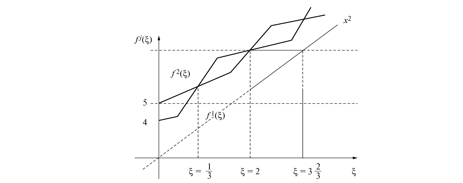 Пусть при ξ=2 MathType@MTEF@5@5@+= feaahGart1ev3aqatCvAUfeBSjuyZL2yd9gzLbvyNv2Caerbov2D09 MBdbqedmvETj2BSbqeeuuDJXwAKbsr4rNCHbGeaGqik8fkY=xipgYl h9vqqj=hEeeu0xXdi9arFj0xirFj0dXdbba91qpK0=yr0RYxfr=Jbb f9q8aq0=yq=He9q8qqQ8frFve9Fve9Ff0dmeaabaqaciaacaGaaeqa baqabeGadaaakeaaqaaaaaaaaaWdbiabe67a4jabg2da9iaaikdaaa a@34B0@  промежуточное изменение коэффициентов q 1 MathType@MTEF@5@5@+= feaahGart1ev3aqatCvAUfeBSjuyZL2yd9gzLbvyNv2Caerbov2D09 MBdbqedmvETj2BSbqeeuuDJXwAKbsr4rNCHbGeaGqik8fkY=xipgYl h9vqqj=hEeeu0xXdi9arFj0xirFj0dXdbba91qpK0=yr0RYxfr=Jbb f9q8aq0=yq=He9q8qqQ8frFve9Fve9Ff0dmeaabaqaciaacaGaaeqa baqabeGadaaakeaaqaaaaaaaaaWdbiaadghapaWaaSbaaSqaa8qaca aIXaaapaqabaaaaa@3336@  и q 2 MathType@MTEF@5@5@+= feaahGart1ev3aqatCvAUfeBSjuyZL2yd9gzLbvyNv2Caerbov2D09 MBdbqedmvETj2BSbqeeuuDJXwAKbsr4rNCHbGeaGqik8fkY=xipgYl h9vqqj=hEeeu0xXdi9arFj0xirFj0dXdbba91qpK0=yr0RYxfr=Jbb f9q8aq0=yq=He9q8qqQ8frFve9Fve9Ff0dmeaabaqaciaacaGaaeqa baqabeGadaaakeaaqaaaaaaaaaWdbiaadghapaWaaSbaaSqaa8qaca aIYaaapaqabaaaaa@3337@  равно q1 = 1 и q2 = 5. Рассчитаем f1(ξ) и f2(ξ) для ξ=2: MathType@MTEF@5@5@+= feaahGart1ev3aqatCvAUfeBSjuyZL2yd9gzLbvyNv2Caerbov2D09 MBdbqedmvETj2BSbqeeuuDJXwAKbsr4rNCHbGeaGqik8fkY=xipgYl h9vqqj=hEeeu0xXdi9arFj0xirFj0dXdbba91qpK0=yr0RYxfr=Jbb f9q8aq0=yq=He9q8qqQ8frFve9Fve9Ff0dmeaabaqaciaacaGaaeqa baqabeGadaaakeaaqaaaaaaaaaWdbiabe67a4jabg2da9iaaikdaca GG6aaaaa@356E@