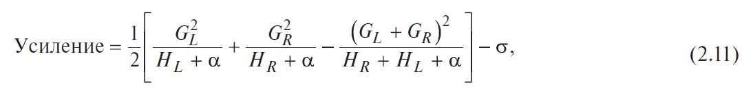 где GL, GR – коэффциенты в функции потерь для 1-го члена ряда Тейлора, HL, HR – коэффциенты в функции потерь для 2-го члена ряда Тейлора, – коэффициенты регуляризации.