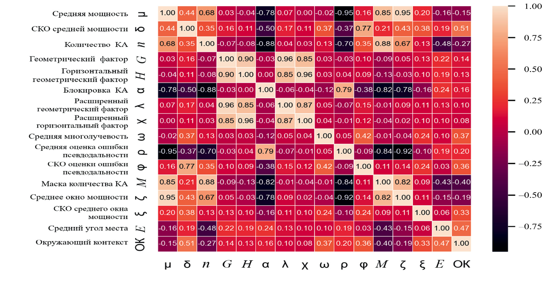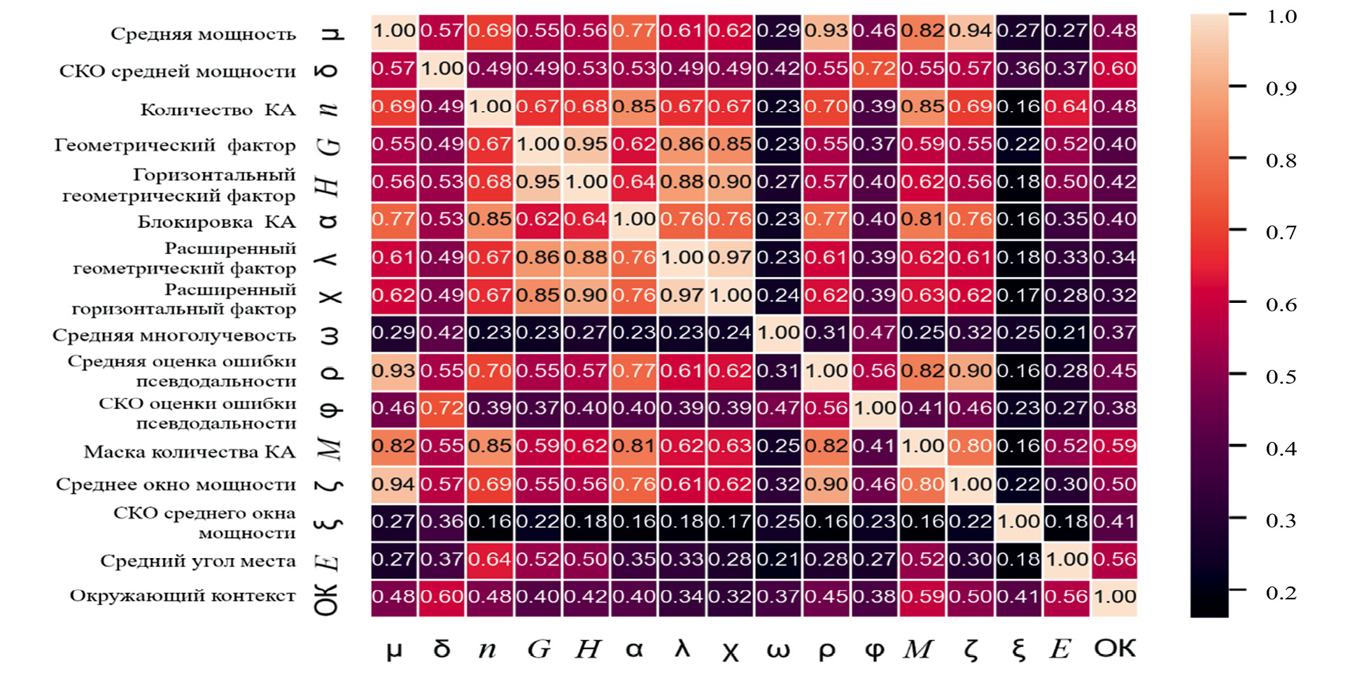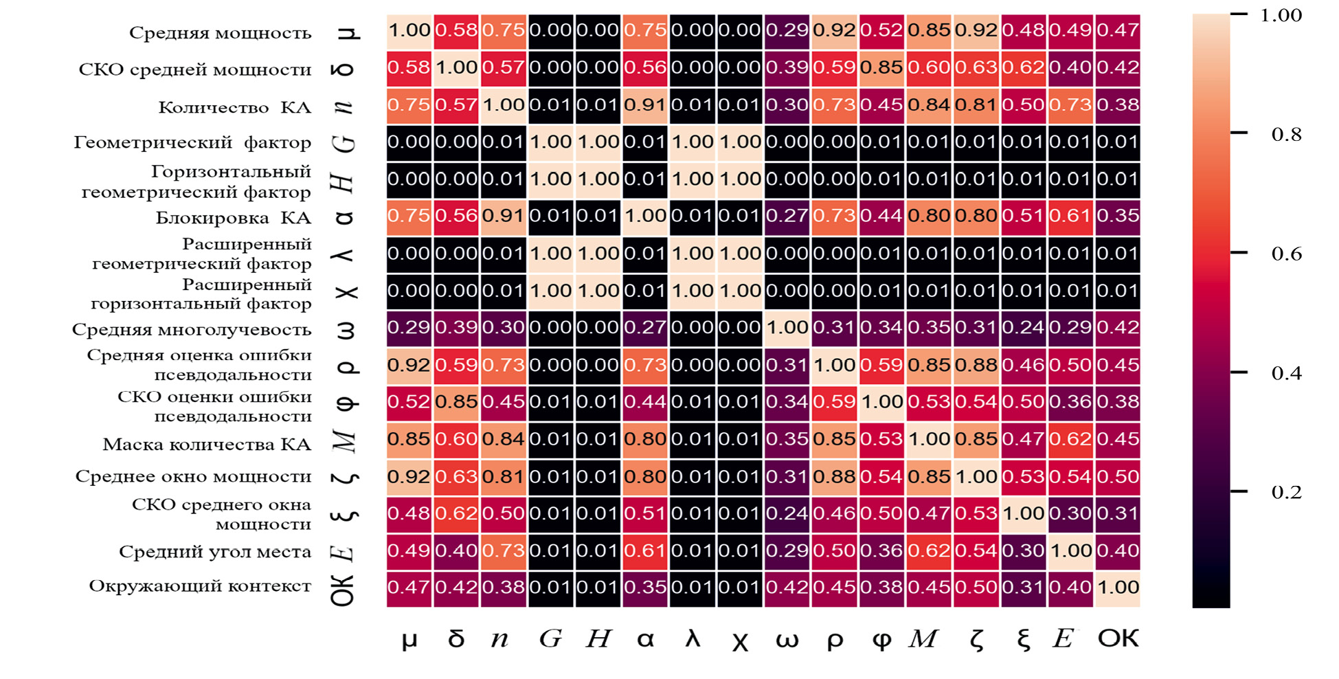 На рис. 3, 4 построена карта корреляций Пирсона и расстояний между признаками сформированного вектора (1.17) для системы ГЛОНАСС. Корреляционный анализ вектора признаков (1.17) по системе ГЛОНАСС показывает наиболее сильную линейную и нелинейную корреляции ОК со следующими признаками: средний коэффициент многолучевоcти , СКО мощности сигнала δ, средний угол места E, маска M по С/No для количества видимых КА и сглаживающего окна для среднего значения С/No, также видно отсутствие связи с геометрическими факторами GDOP, HDOP, , что связано с отсутствием измерений из-за малого количества видимых КА. Оставшиеся признаки для ГЛОНАСС и GPS сильно коррелируют с упомянутыми выше признаками, поэтому их использование нецелесообразно и может привести к неправильному определению ОК.
