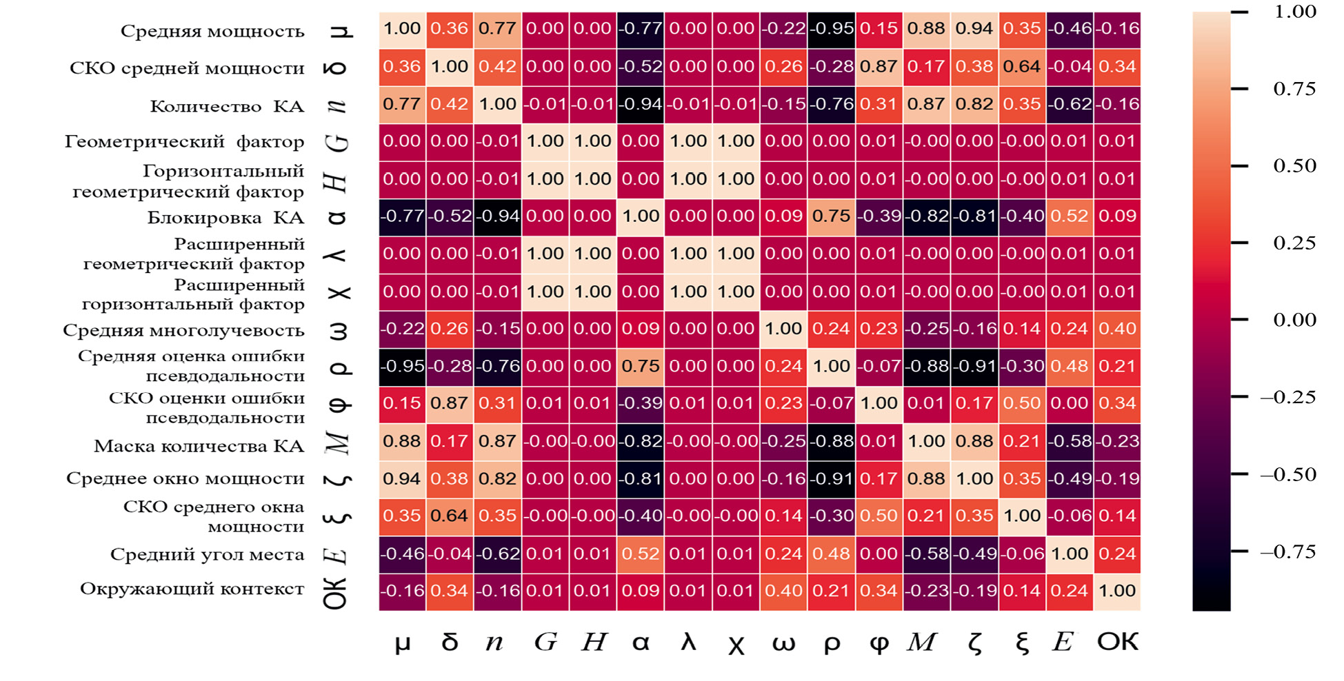 На основе анализа таблиц и карт корреляций можно сформировать следующий оптимальный вектор признаков для систем ГЛОНАСС и GPS: