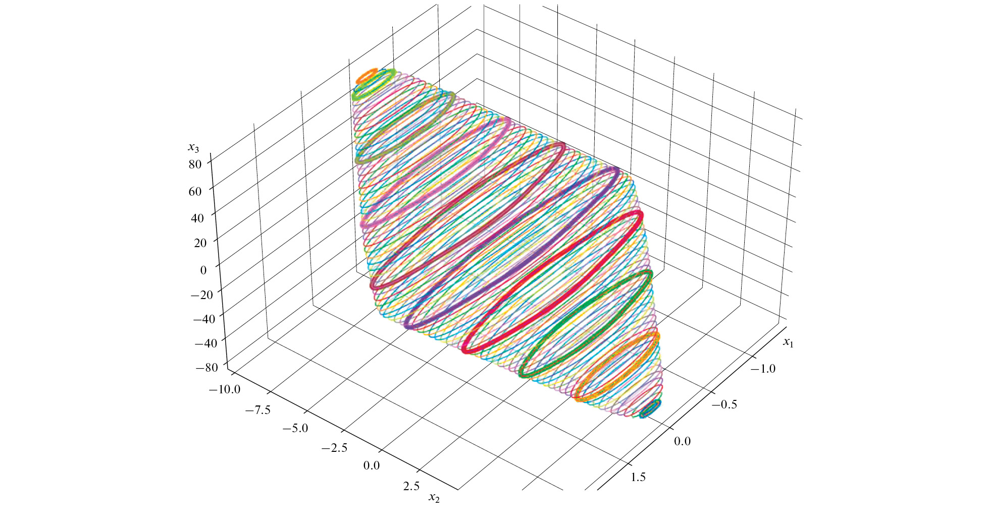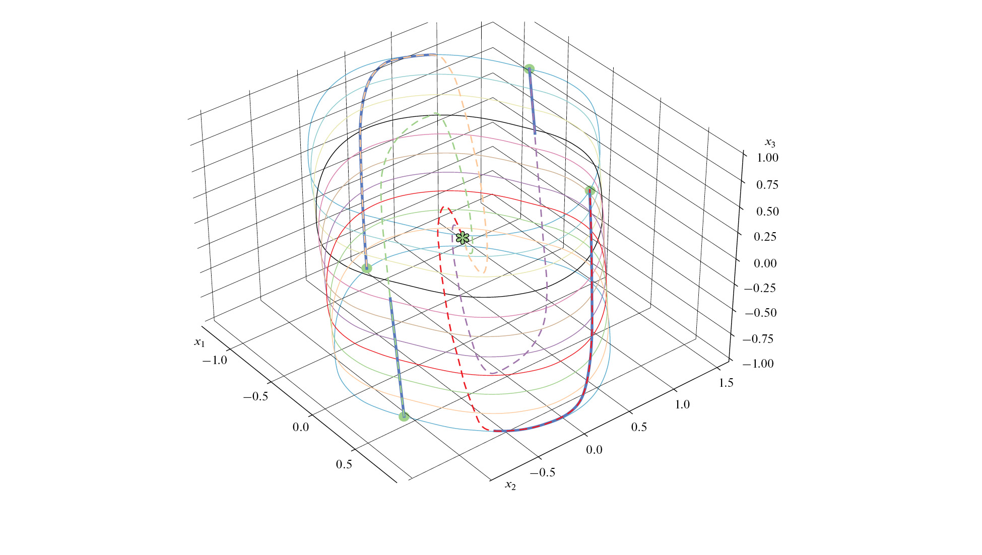 Как видно из рисунка, форма поверхности заметно отличается от эллипсоидальной формы квадратичной функции Ляпунова линейной системы. Для систем, конструкция которых не допускает нарушения фазового ограничения (как в вышеупомянутой механической системе), больший интерес представляет множество, образованное пересечением инвариантных областей Vc = {x : V(x) ≤ c} и Π (5.2), так как “хвосты” первой, отсекаемые плоскостями x3 = ±1, содержат только траектории с начальными условиями, не удовлетворяющими фазовому ограничению. На рис. 3 и 4 показана цилиндроподобная область, полученная пересеченим множества Vc, изображенного на рис. 2 с множеством Π, вместе с несколькими траекториями, начинающимися на ограничивающей область поверхности уровня.