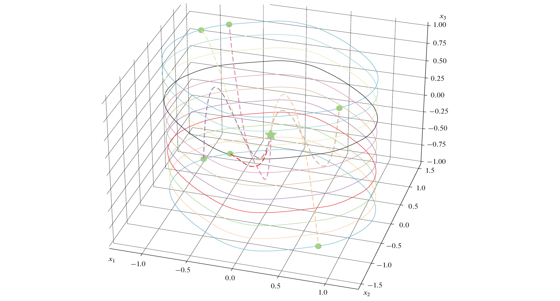 На рис. 3 изображены траектории, начинающиеся в точках, в которых производная функции Ляпунова в силу системы равна нулю. Начальные сегменты таких траекторий (показаны сплошными линиями) лежат на поверхности инвариантной области. После того, как проекция траектории на плоскость (x1,x2) пересекает границу D3 (рис. 1), производная становится отрицательной и траектория уходит внутрь области. Участки траекторий, лежащие внутри области, изображены пунктирными линиями. Траектории, начинающиеся в точках, в которых производная отрицательна, сразу уходят внутрь области (рис. 4).