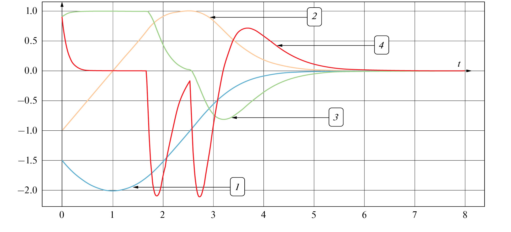 Результаты решения задачи стабилизации системы для начальных условий x1(0) = -1.5, x2(0) = -1.0, x3(0) = 0.9 представлены на рис. 5, демонстрирующие эффективность стабилизации. Кривые, помеченные цифрами 1-4, показывают графики зависимостей от времени отклонения x1, скорости x2, ускорения x3 и управления U соответственно. В начальный момент времени система движется в противоположном от положения равновесия направлении, величина отклонения после естественного роста на начальном этапе быстро (экспоненциально) убывает, фазовое ограничение выполняется для любого t, управление умеренно ограничено и не приводит к перерегулированию.