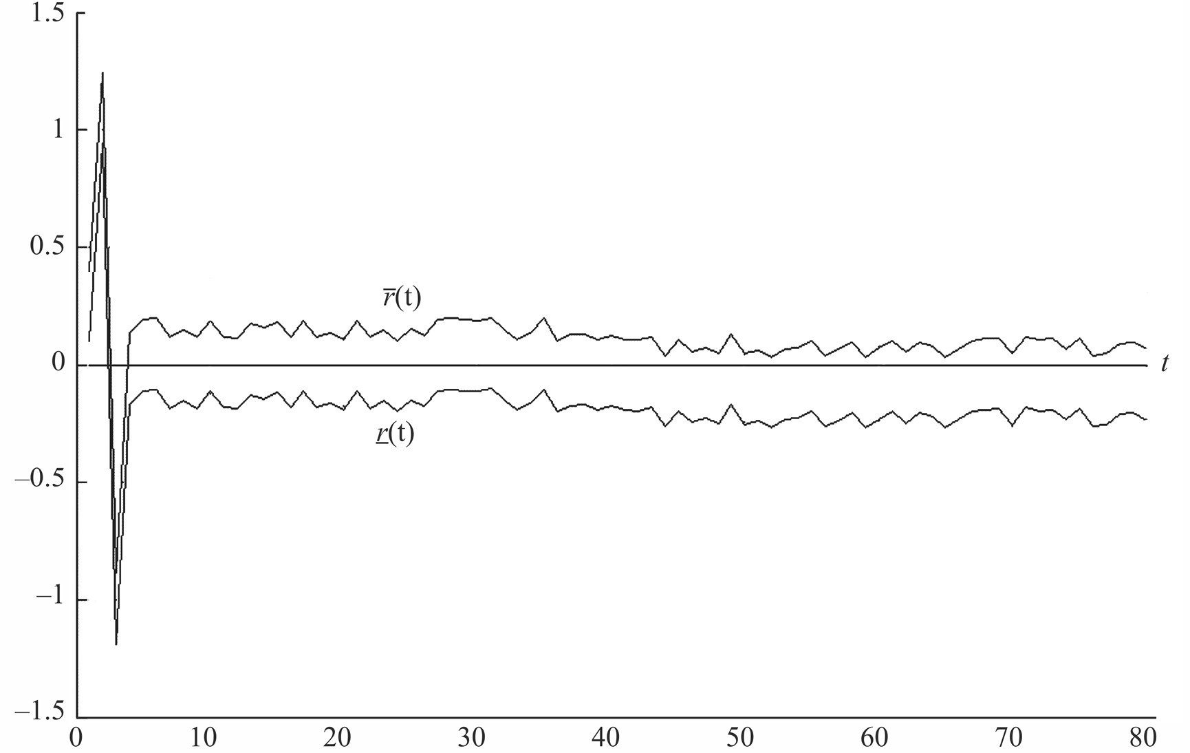 По сравнению с (3.1), соотношения паритета (3.2) содержат дополнительные члены и формирующие искомый интервал по аналогии с интервальным наблюдателем [14, 15]. Переменные и называются невязками, поскольку они описывают рассогласование между поведением системы (1.1) (представленным переменной ) и поведением соотношений паритета (представленными переменными и согласно (3.2)).