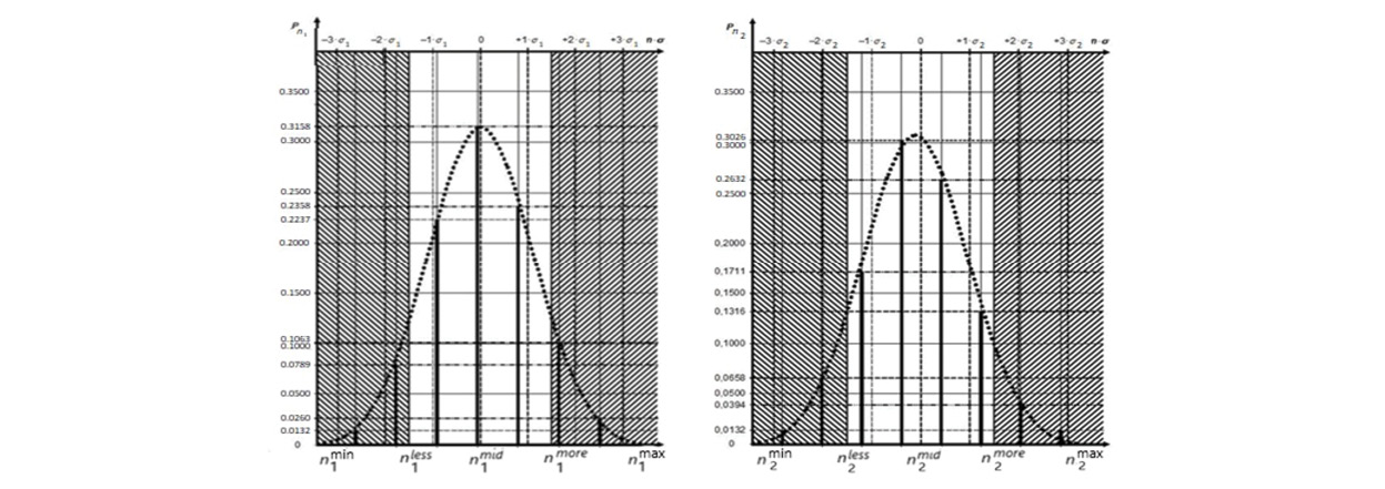 Рис. 6. Графики вероятностного распределения контролируемых значений частот вращения РНД и РВД ТРДД одной серии относительно их математических ожиданий n1mid и n2mid.